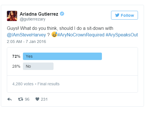 Quyết định tham gia The Steve Harvey Show có thể liên quan đến trạng thái (status) mà Ariadna đăng tải lên trang Twitter hôm 7/1. Trong đó, người đẹp 22 tuổi hỏi người hâm mộ liệu cô có nên đồng ý làm khách mời trong talkshow của Steve. Có 72% trong tổng số hơn 4200 phiếu bầu khuyên Ariadna nhận lời.