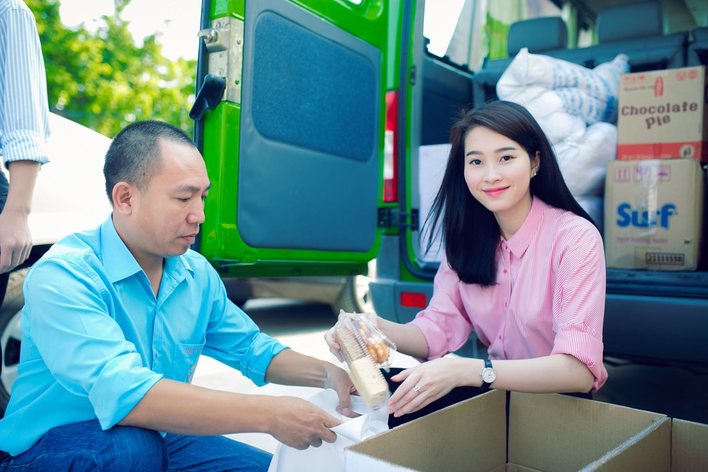 | Đặng Thu Thảo đích thân sắp xếp từng món quà cho các cụ già. |