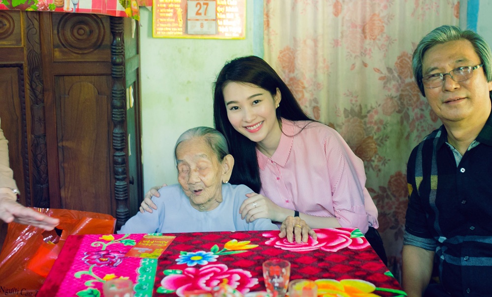 | Người đẹp trò chuyện với một cụ bà lớn tuổi. Cô động viên cụ giữ gìn sức khỏe đón Tết cùng con cháu. |