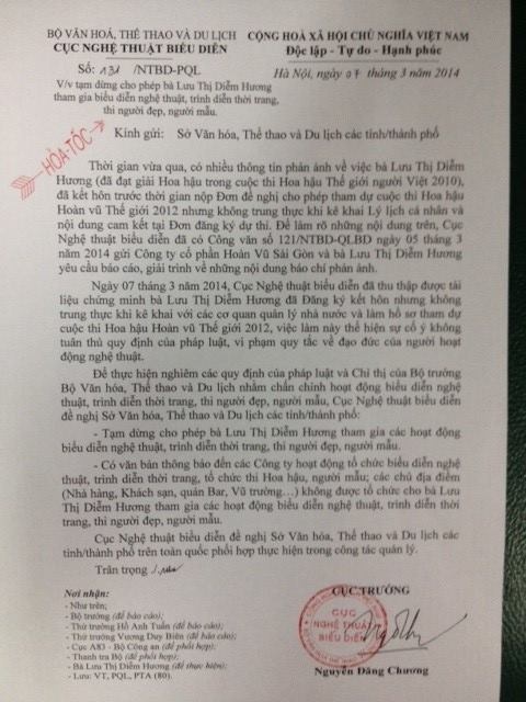 Nội dung công văn nhấn mạnh: "Tạm dừng cho phép bà Lưu Thị Diễm Hương tham gia các hoạt động biểu diễn nghệ thuật, trình diễn thời trang, thi người đẹp, người mẫu".