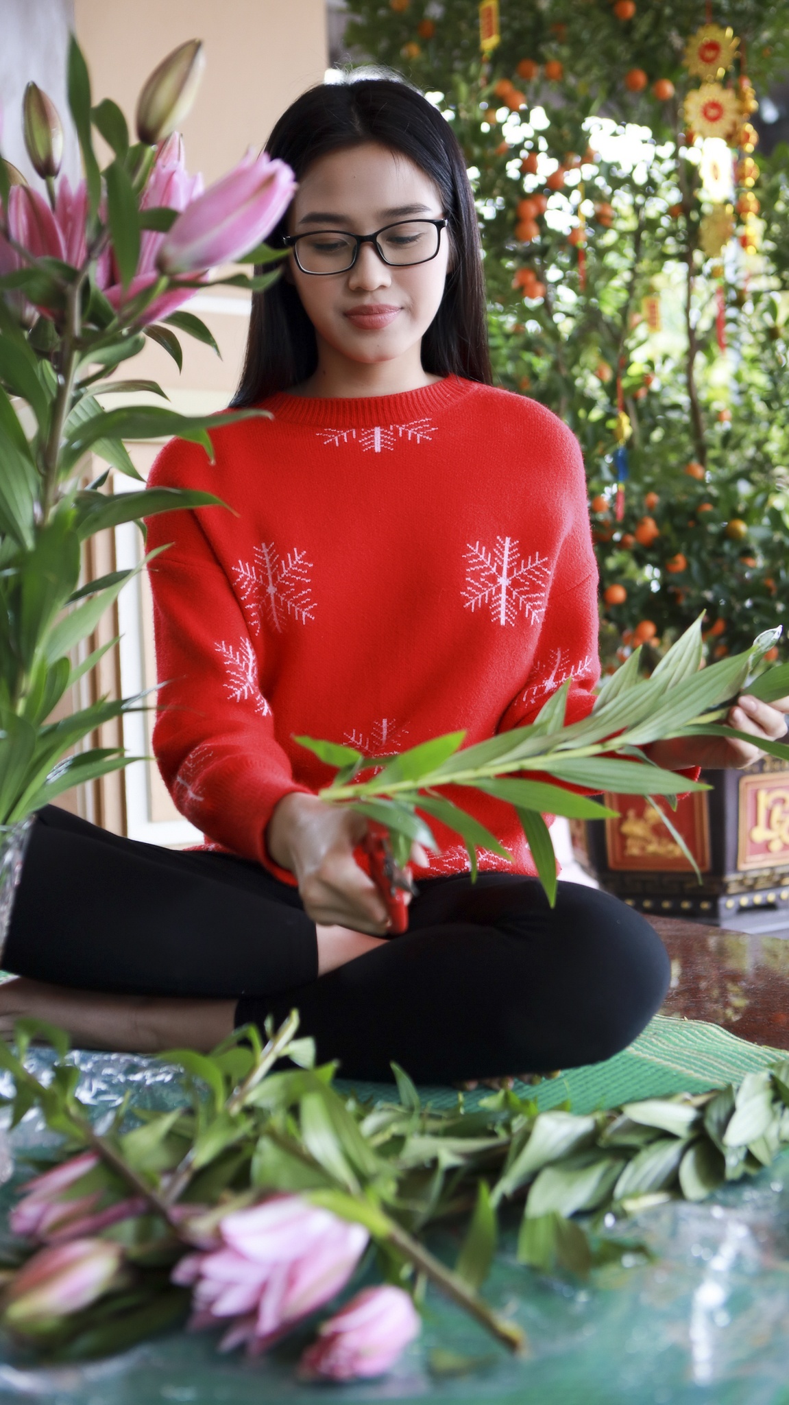 | Với tôi, Tết là quãng thời gian dành cho gia đình. Tôi thích đón Tết truyền thống, được quây quần với mọi người, cắm hoa, gói bánh, chia sẻ những câu chuyện trong năm cũ. Tết miền Bắc trời se lạnh, thêm chút mưa lất phất nhưng không cản được sự háo hức sắm sửa Tết của tôi. |