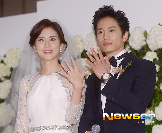 Ji Sung và Lee Bo Young "khoe" nhẫn cưới.