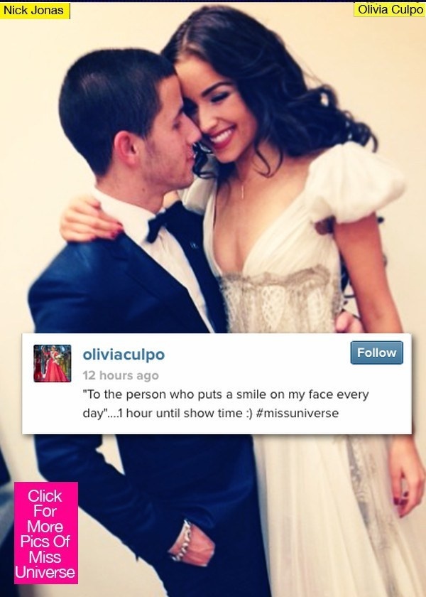 Mới đây, một nguồn tin từ trang Missosology tiết lộ, Hoa hậu Hoàn Vũ 2012 - Olivia Culpo đã mang thai với thành viên nhóm nhạc Jonas Brothers - Nick Jonas. Cô đã mang thai được 6 tuần. Đây cũng là lý do cô khư khư dùng khăn lông vũ che đi phần bụng khi biểu diễn áo tắm trong đêm chung kết Miss Universe 2013.