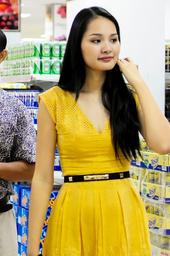 | Cô ăn mặc rất giản dị và nhẹ nhàng với bộ đầm vàng. |