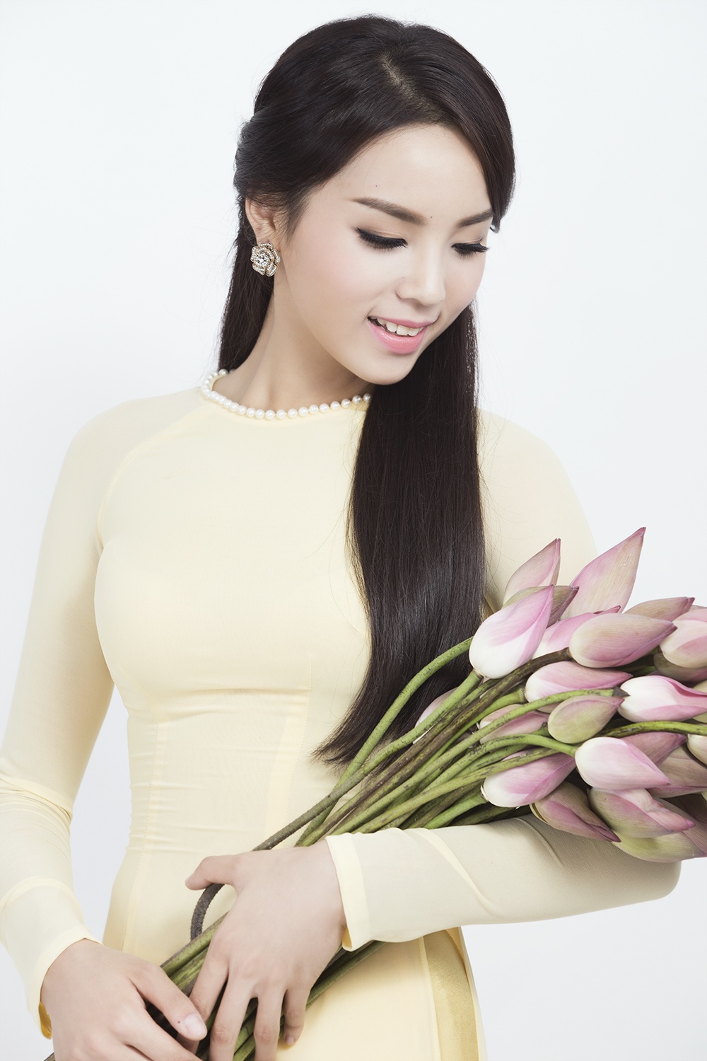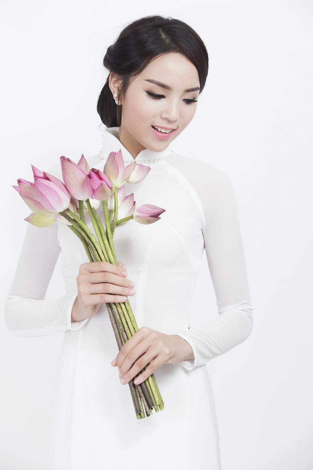 | Kết hợp với áo dài là bó hoa sen biểu tượng của văn hóa Việt. Người đẹp yêu kiều, nâng niu bó hoa khi tạo dáng, thể hiện hình ảnh mới. |
