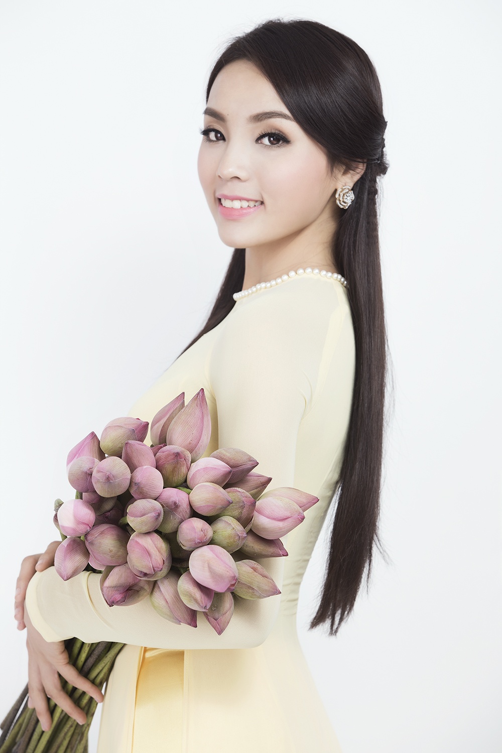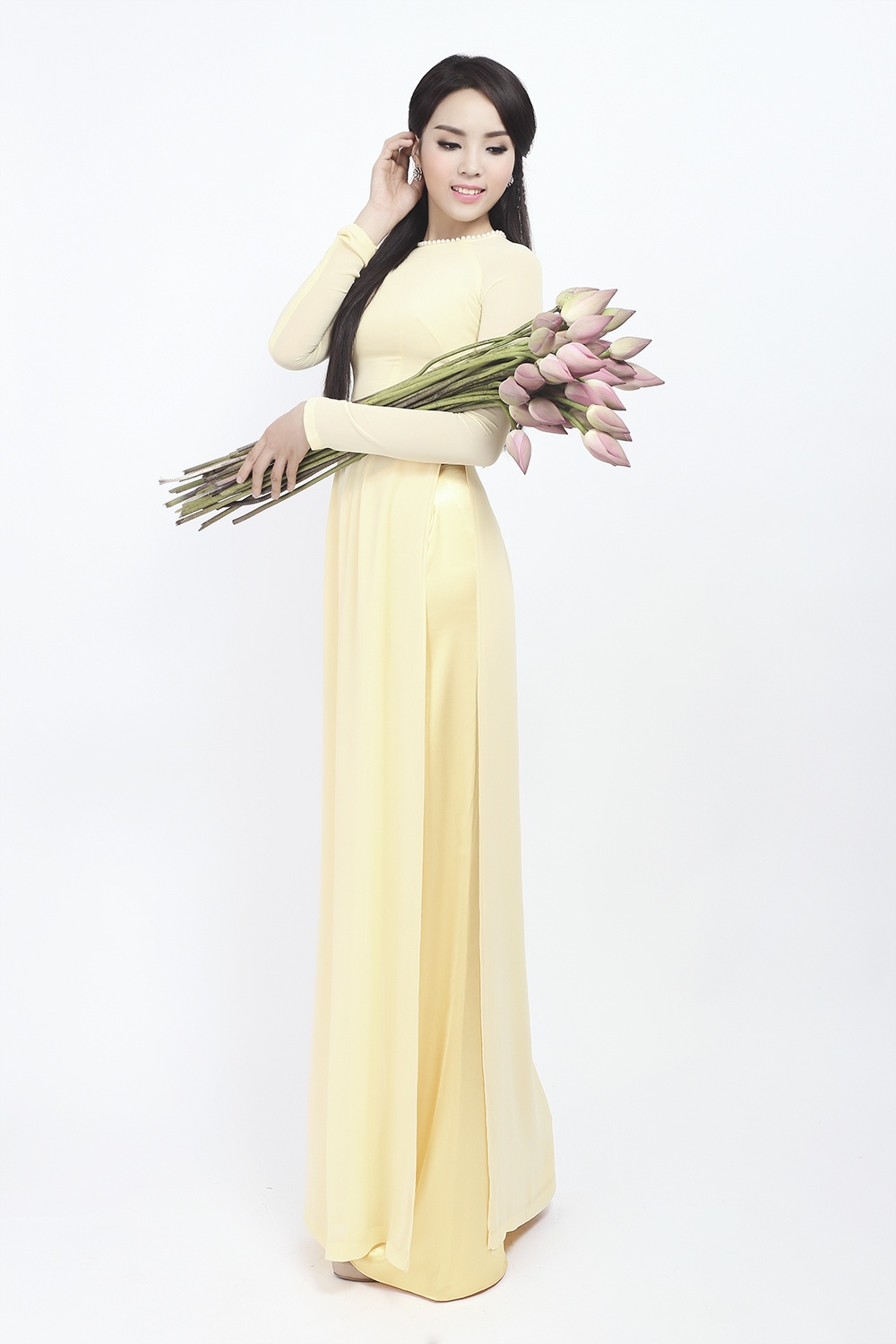 | Vẻ đẹp nữ tính, duyên dáng của hoa hậu 18 tuổi khá phù hợp concept hình ảnh truyền thống. Thiết kế áo dài tông màu vàng nền nã, êm dịu, tôn nét đẹp thuần Việt của nữ sinh viên ĐH Ngoại thương Hà Nội. |