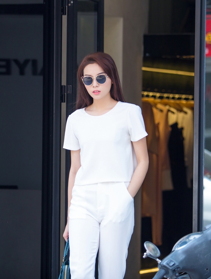 | Chiều 17/10, Kỳ Duyên xuống phố Hà thành với bộ trang phục "cây trắng" sành điệu. Người đẹp để tóc suông, trang điểm nhẹ và đeo kính râm cá tính. |