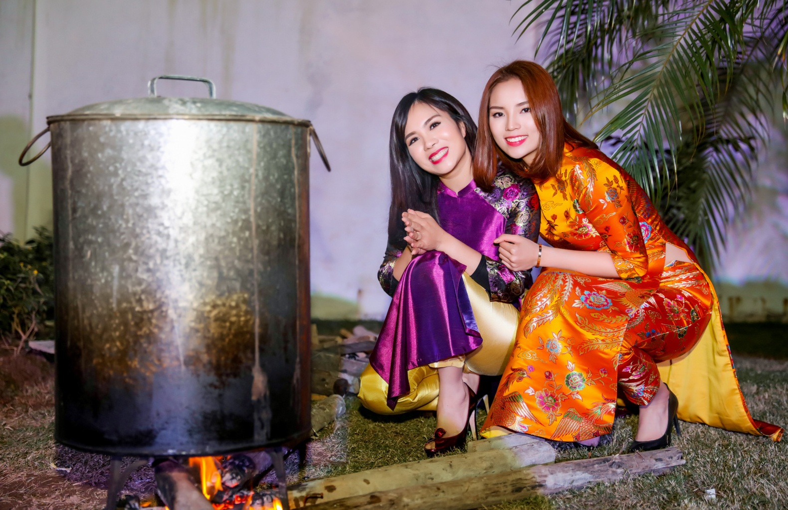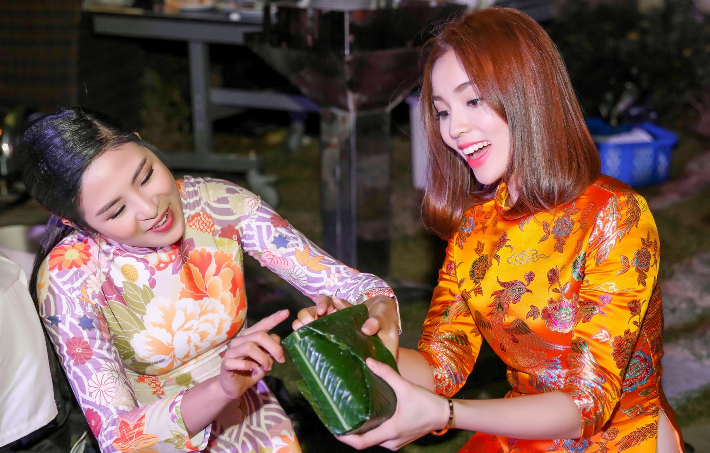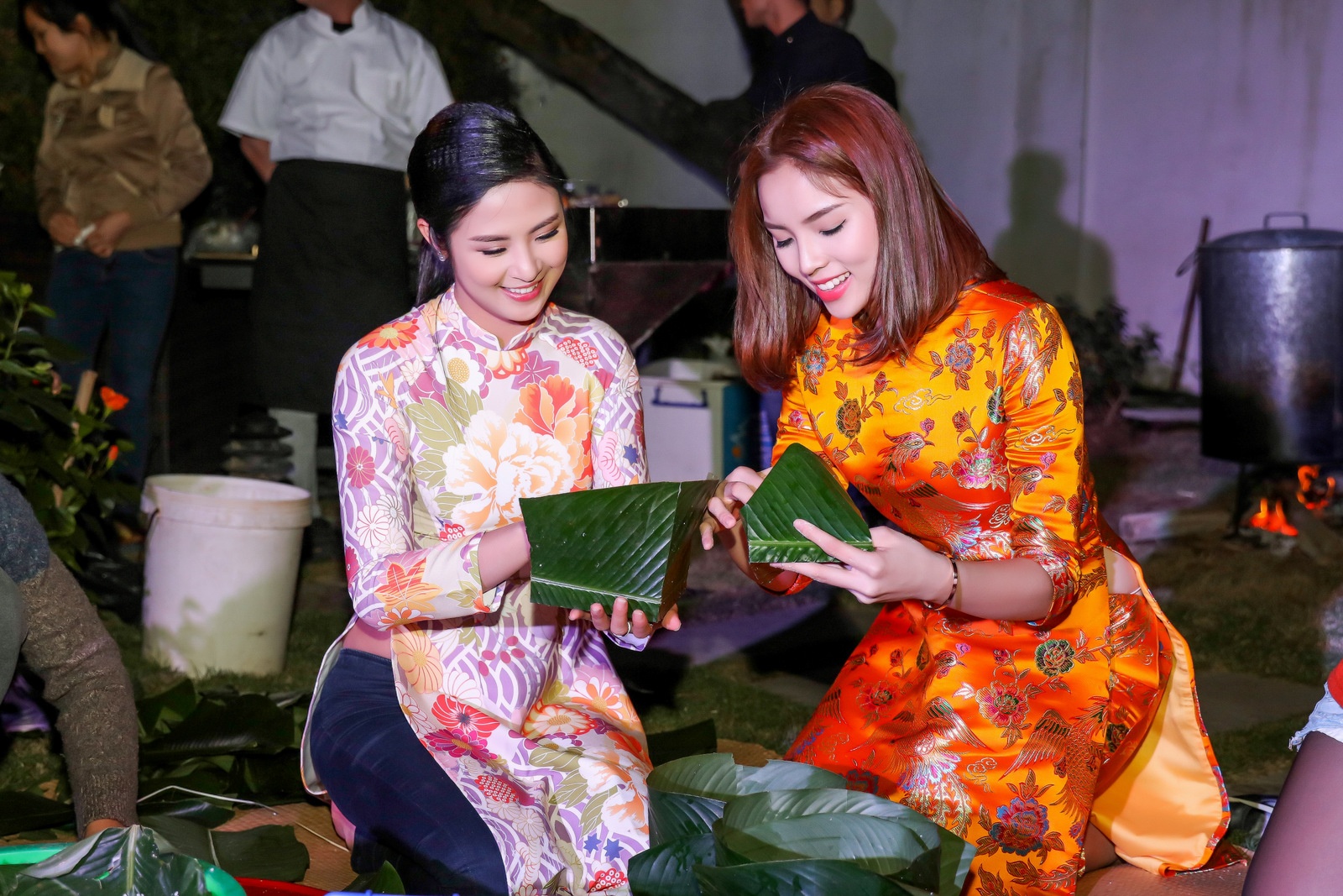 Tại bữa tiệc, các người đẹp cùng nhau trải nghiệm nét truyền thống đẹp của người dân miền bắc trong mỗi dịp tết: gói bánh chưng và cùng nhau đốt lửa canh nồi bánh. Trong ảnh, cô chụp cùng doanh nhân Lưu Nga. |