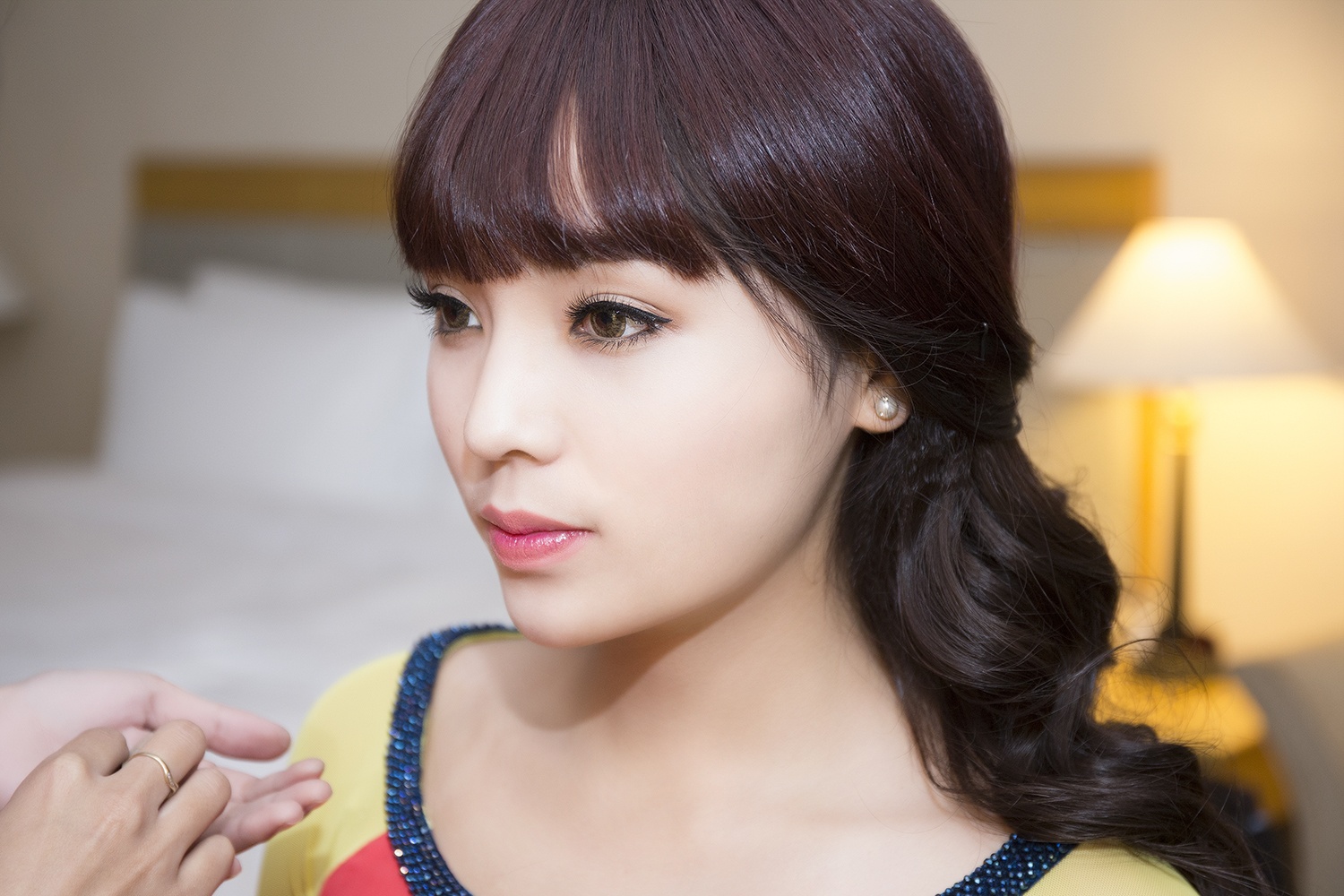 | Hoa hậu 18 tuổi được trang điểm với tông màu nude nhẹ nhàng, trong trẻo, phù hợp với nước da trắng ngần và nét đẹp ngây thơ vốn có ở cô. Lần này, chuyên gia làm tóc giúp tân hoa hậu chọn kiểu tóc mái ngang để làm mới hình ảnh. Kiểu tóc lạ cùng tông trang điểm ăn nhập giúp người đẹp gốc Nam Định nổi bật và rạng rỡ hơn hẳn. |