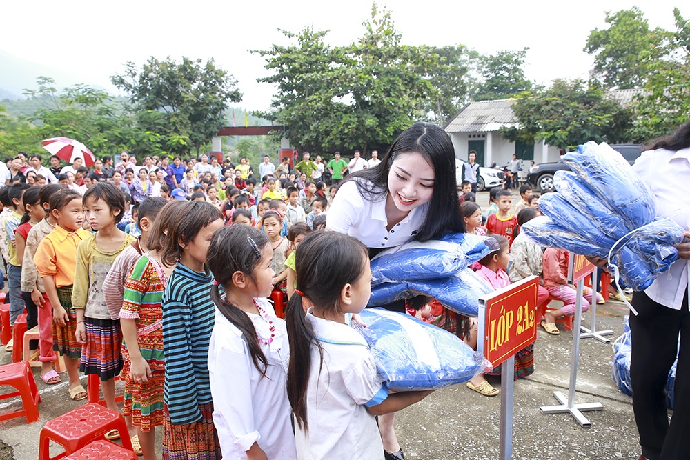Người đẹp xứ Thanh vừa cùng bạn bè có mặt tại một huyện miền núi để tặng quà cho những em nhỏ kém may mắn.
