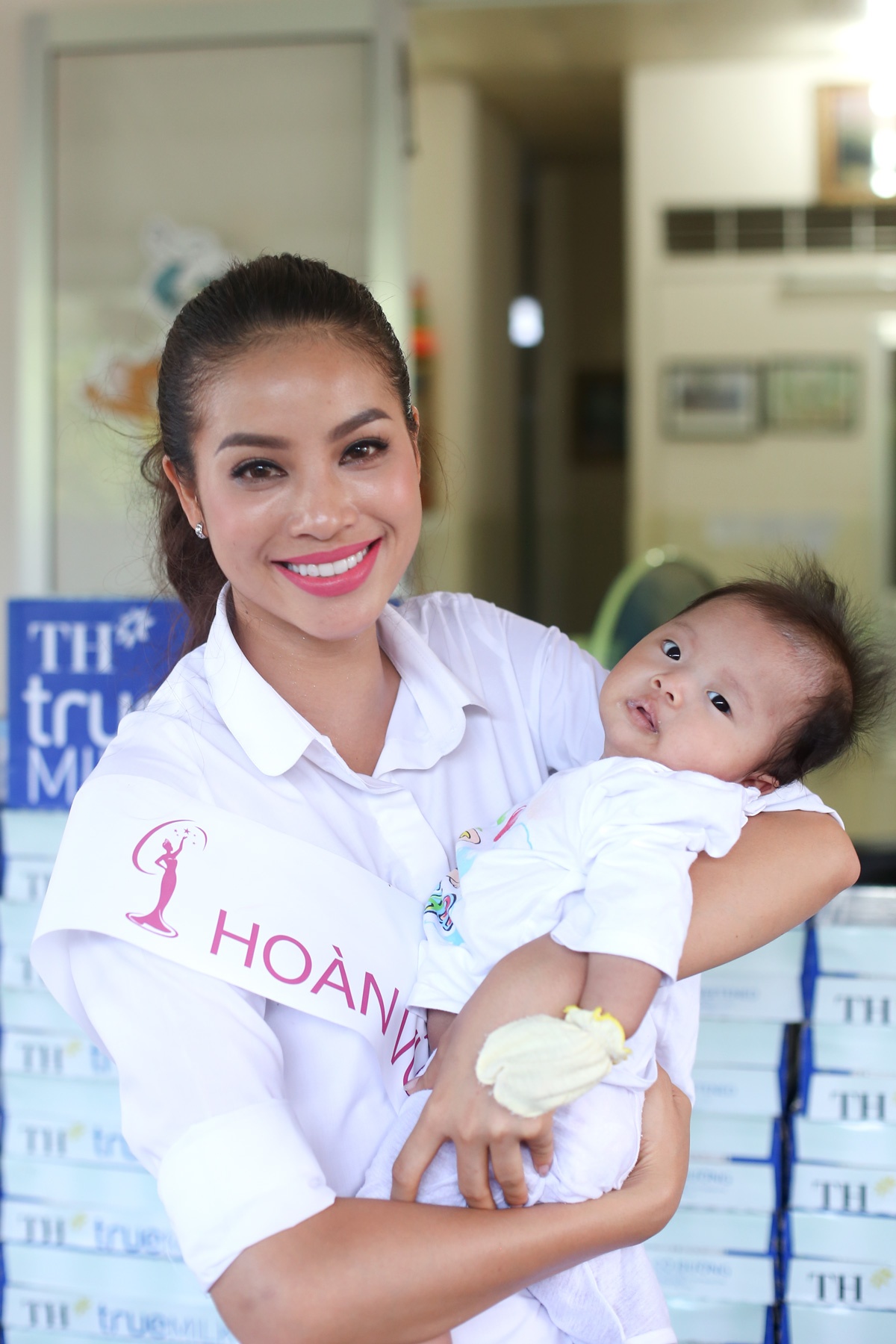Bên cạnh việc thăm hỏi, top 3 Hoa hậu Hoàn vũ Việt Nam 2015 còn gửi tặng sữa như món quà cho các bé.