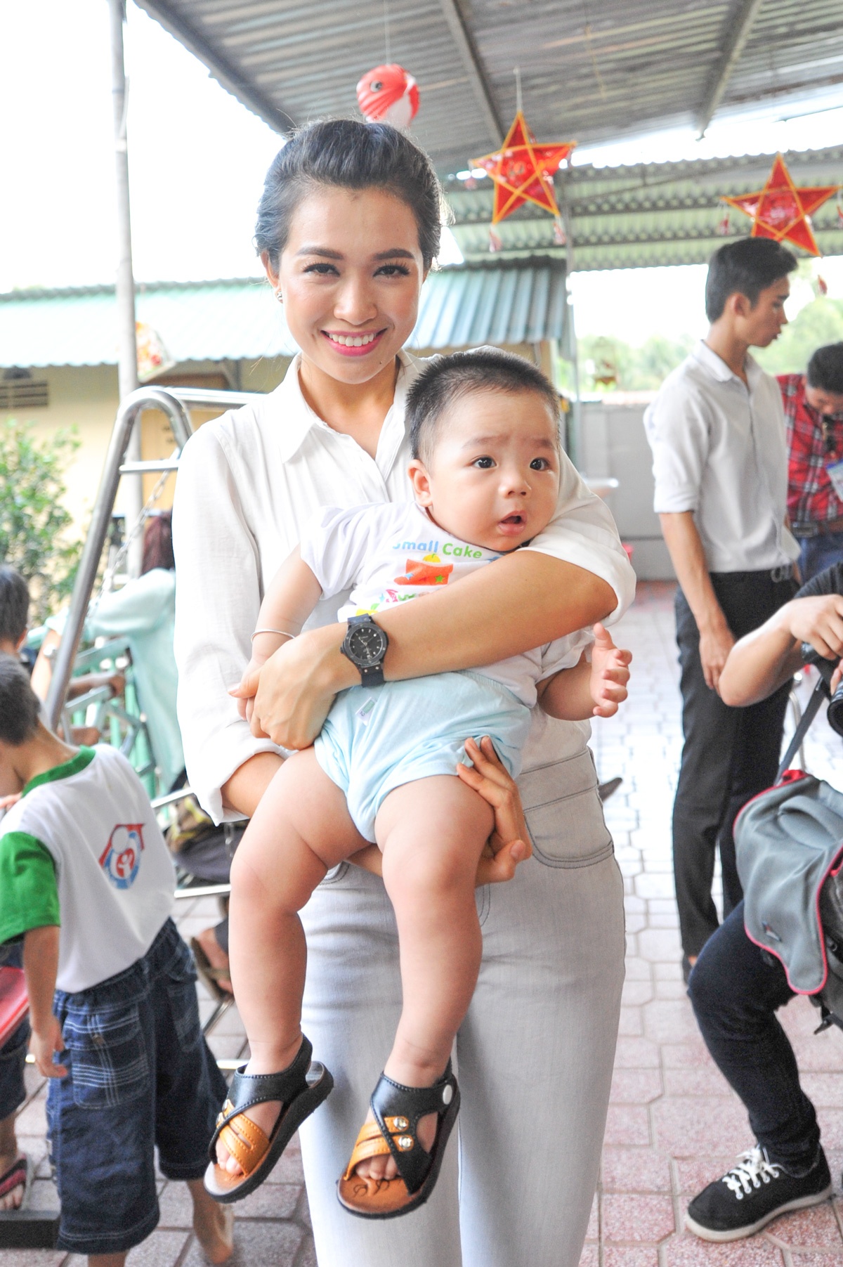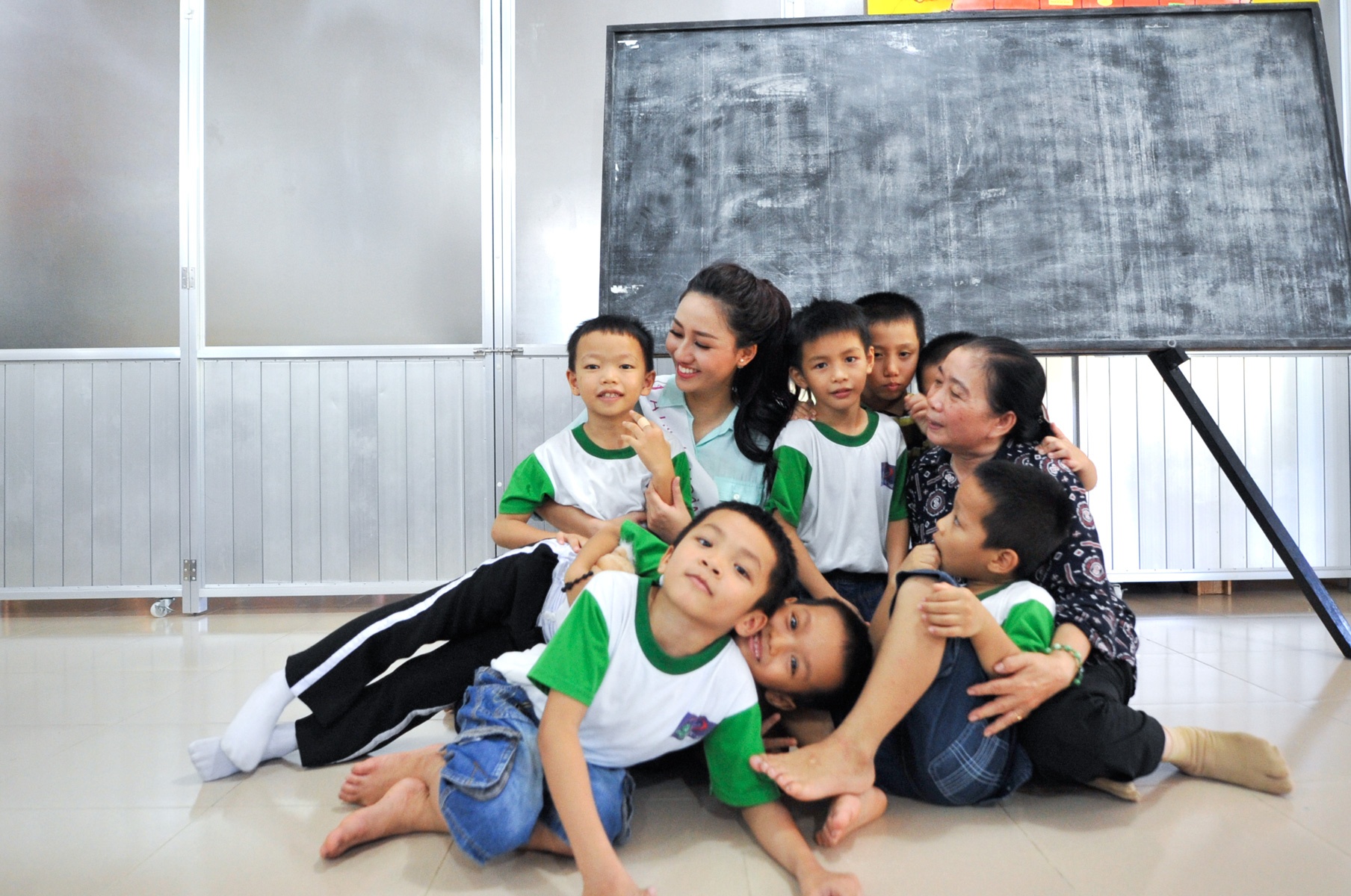 Á hậu Lệ Hằng cũng diện trang phục đơn giản khi đến mái ấm tình thương thăm các bé cơ nhỡ.