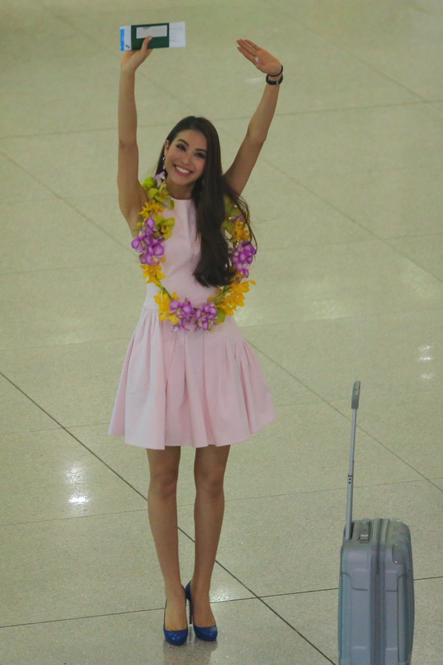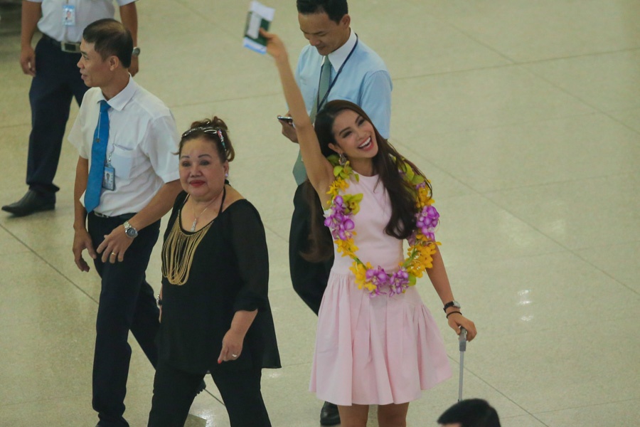 Sau chuyến bay dài hơn 12 tiếng, hoa hậu Phạm Hương có mặt ở sân bay Tân Sơn Nhất lúc 13h ngày 27/12 như thông báo từ trước.