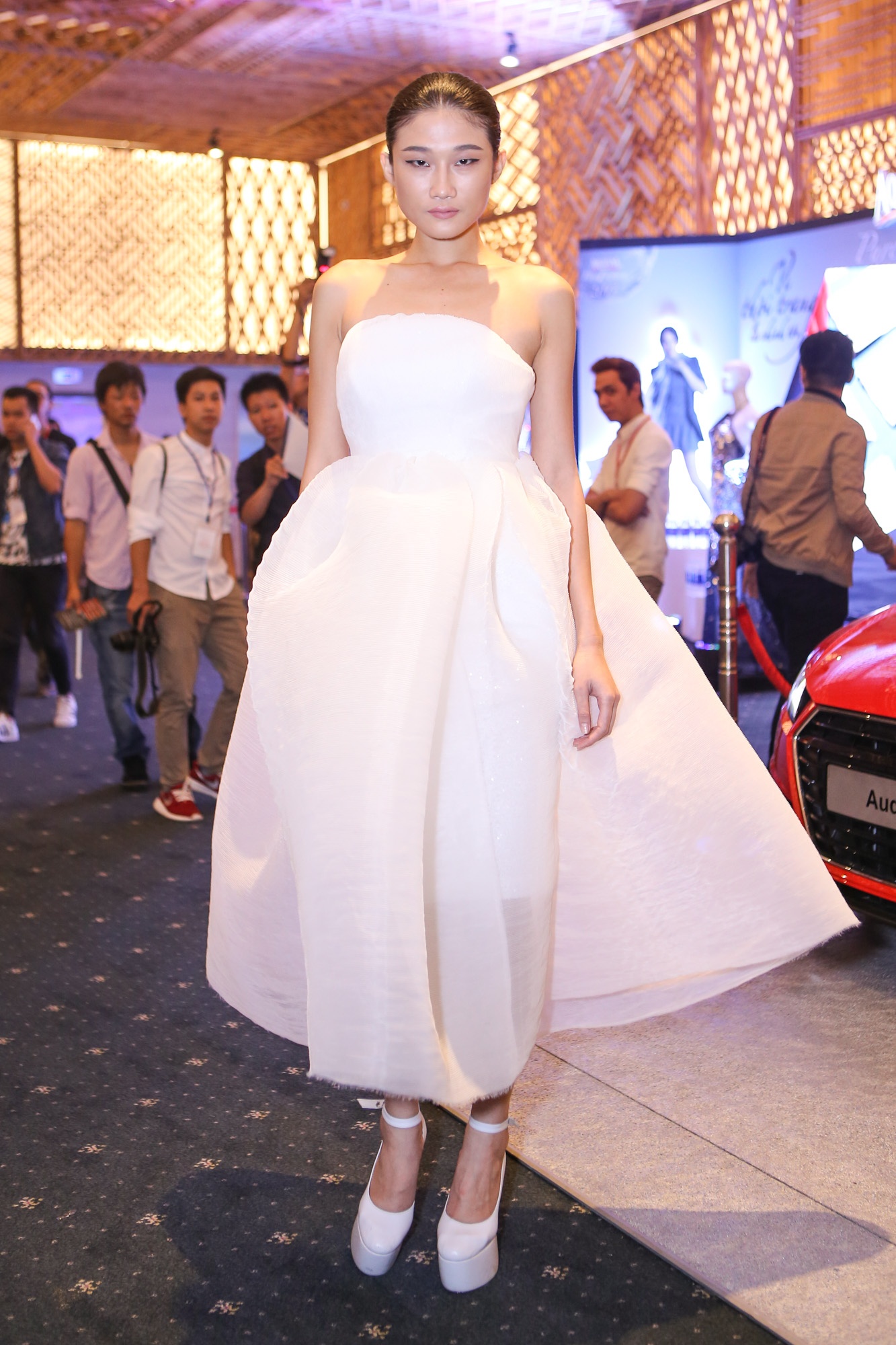 Người đẹp Hải Phòng thay đổi phong cách khi diện đầm tông trắng "kín cổng cao tường" tham dự bế mạc tuần lễ thời trang.