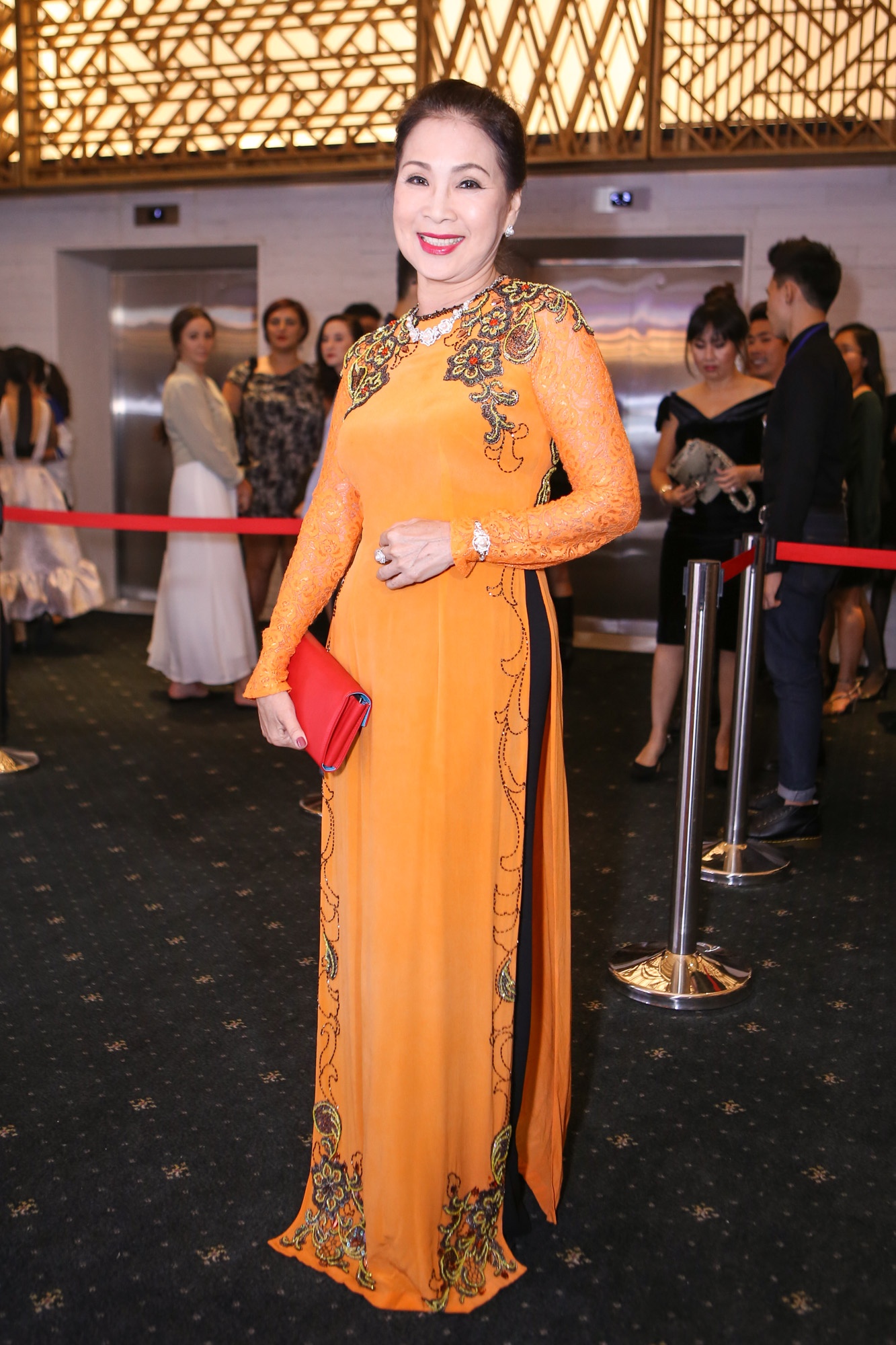 | Diễn viên Kim Xuân nền nã áo dài khi đến thưởng thức show thời trang. |