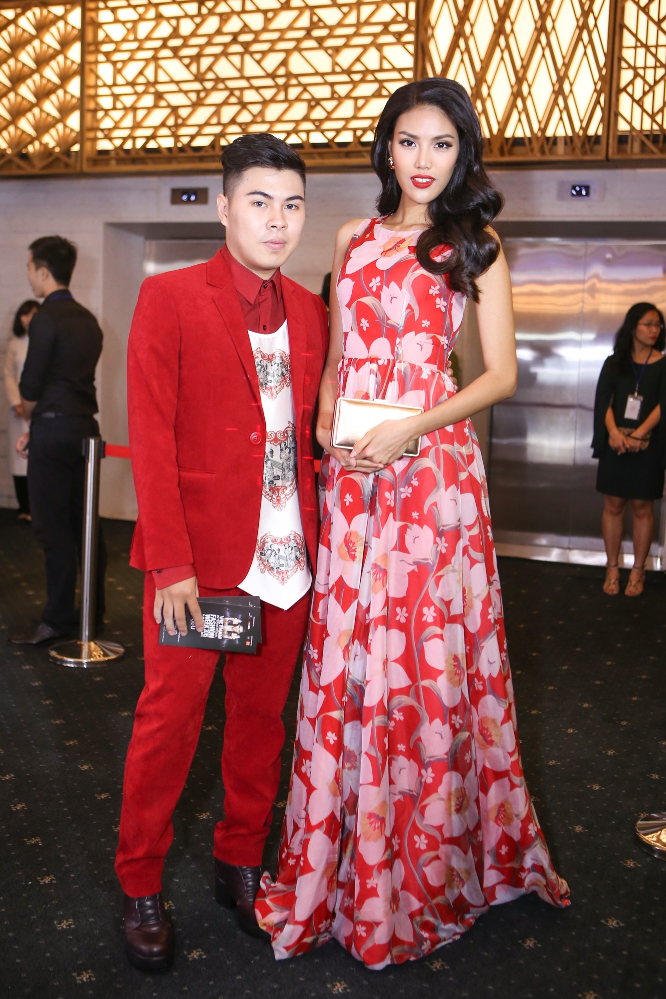| Lan Khuê nổi bật trong bộ cánh họa tiết hoa lãng mạn, ton sur ton gam đỏ cùng NTK Nguyễn Quang Việt. |