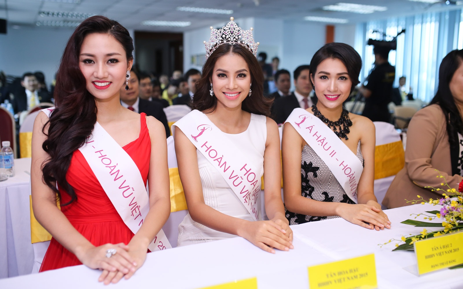 | Hoa hậu Phạm Hương cuốn hút trong bộ đầm trắng kín đáo. Tông trang điểm và tóc xoăn quyến rũ phù hợp vẻ đẹp hiện đại của giảng viên trường Cao đẳng Văn hóa Nghệ thuật - Du lịch TP HCM. Đối lập vẻ nữ tính, cổ điển của Phạm Hương và Lệ Hằng, người đẹp Hà thành - Trà My - diện đầm tông đỏ bắt mắt. Cô gái nhỏ tuổi nhất top 3 Hoa hậu Hoàn vũ Việt Nam 2015 tự tin không kém các đàn chị. |