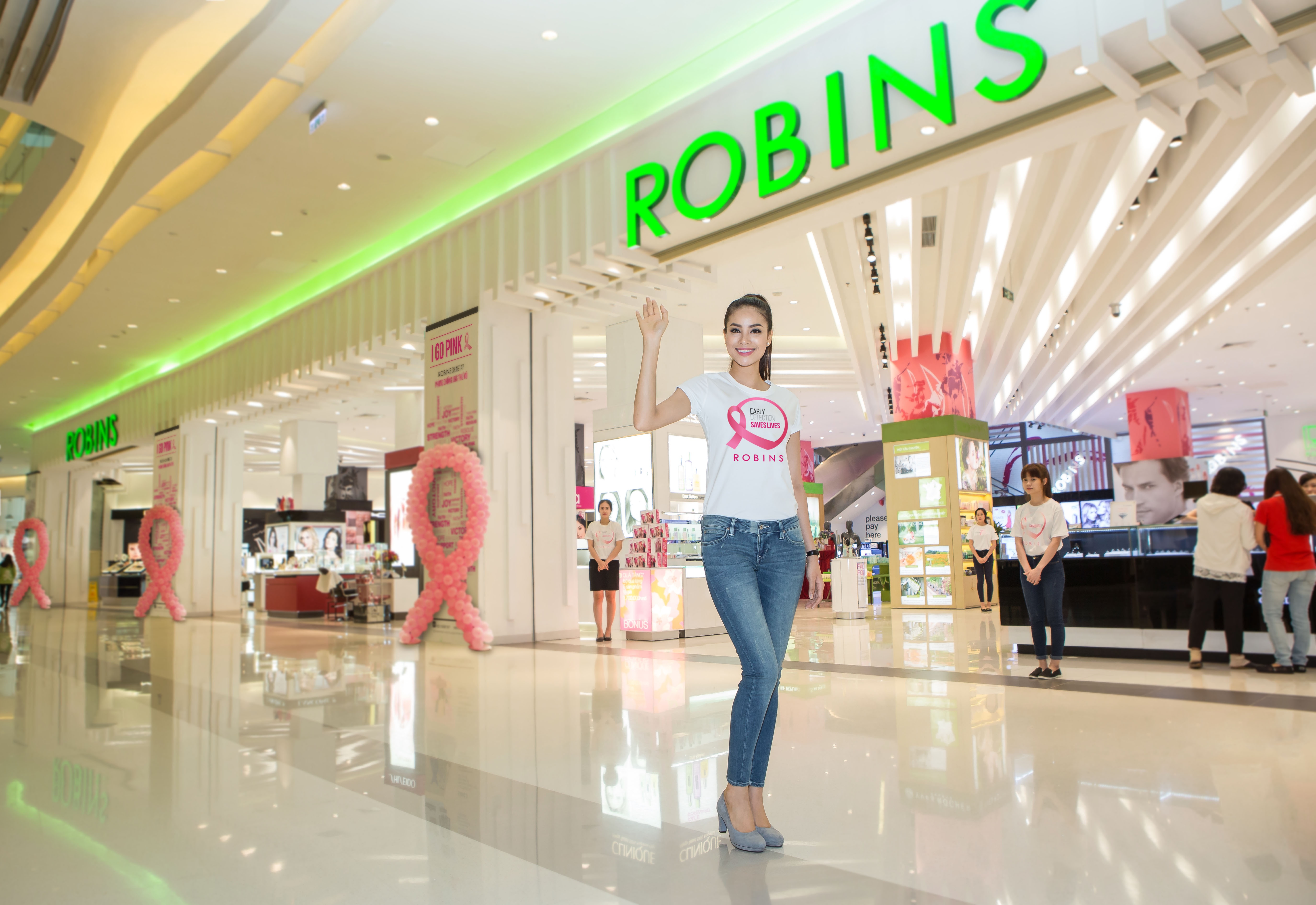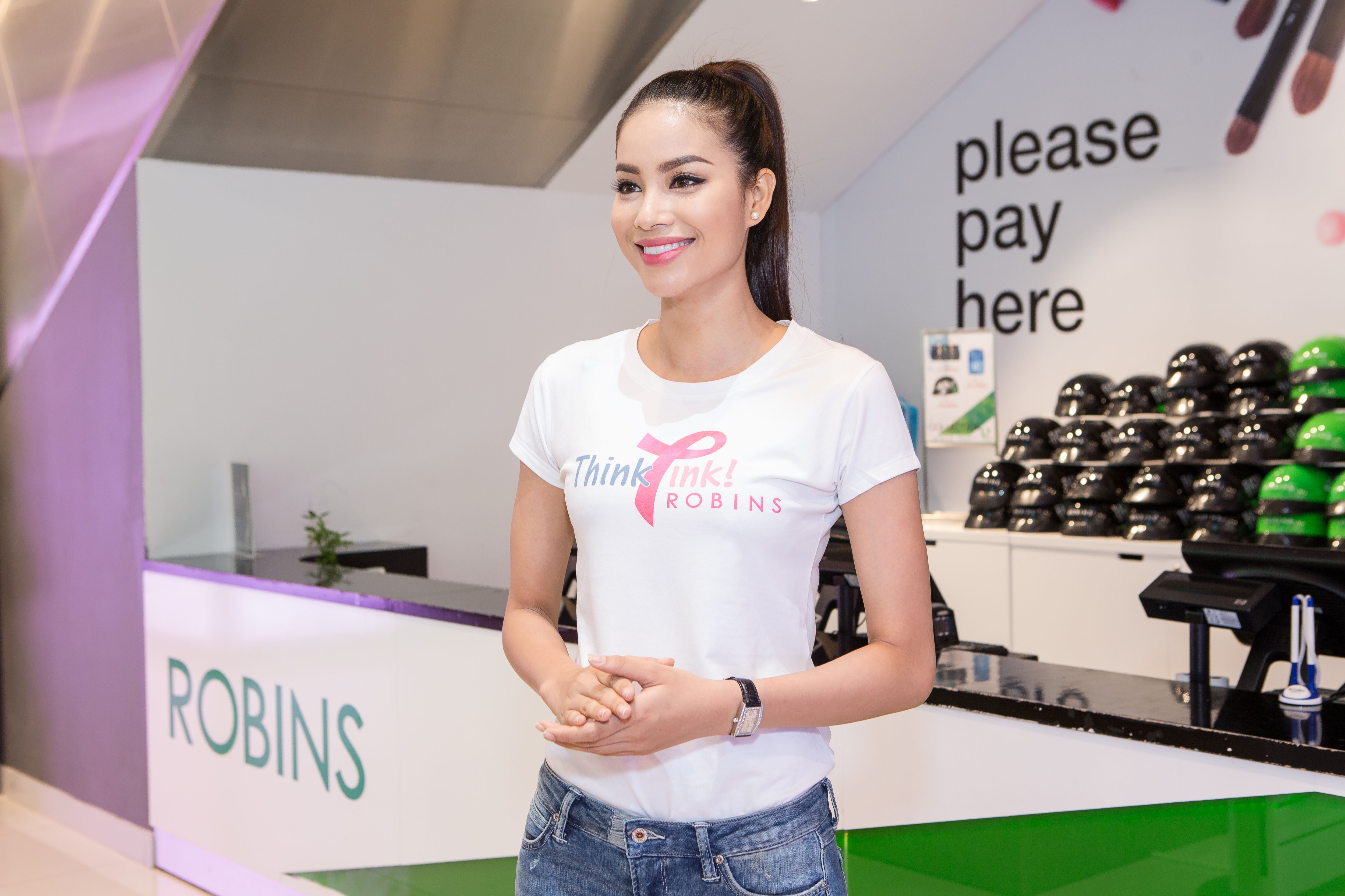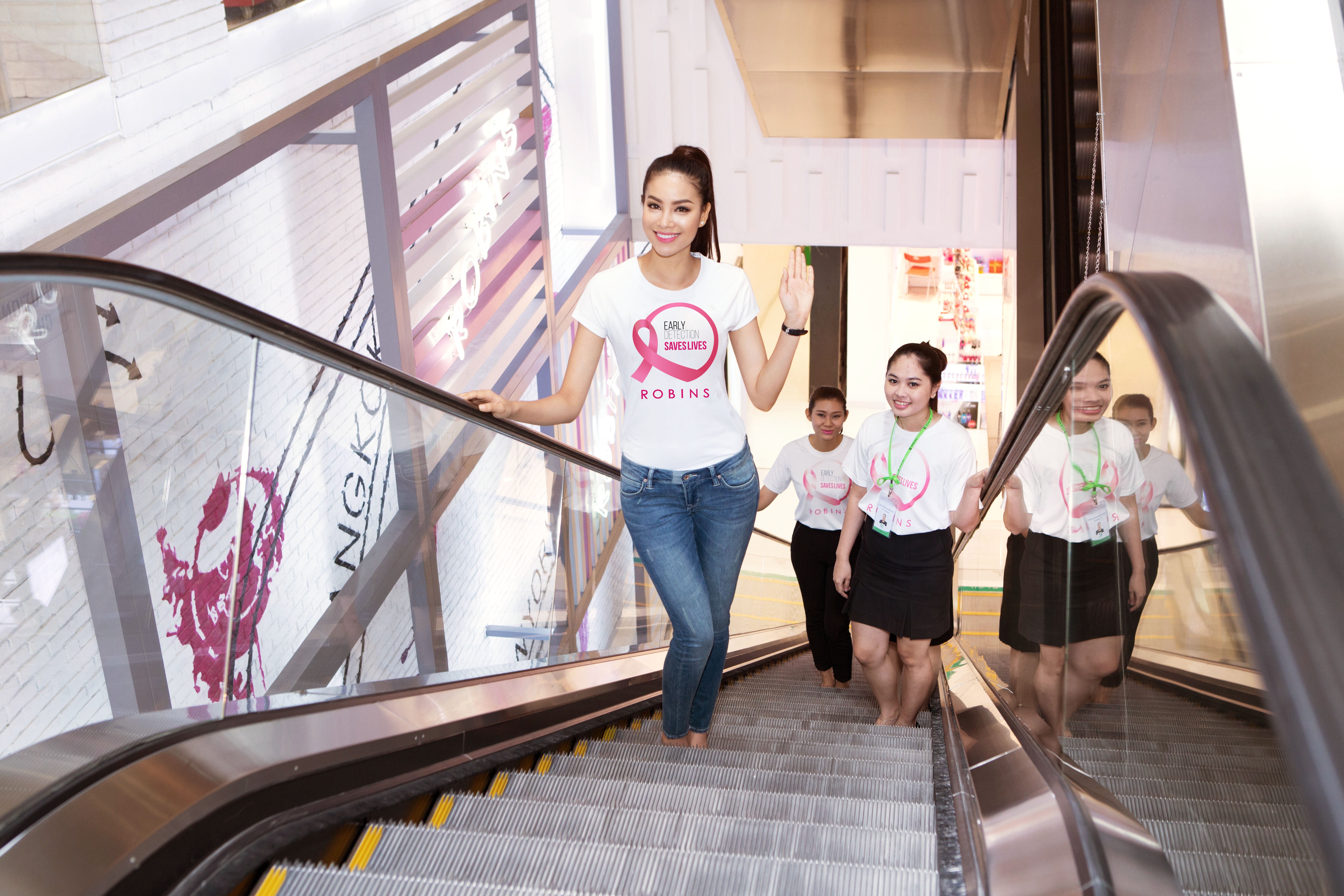 | Tuy lịch trình làm việc khá bận rộn sau khi đăng quang, Phạm Hương vẫn rất xinh đẹp và tươi tắn khi xuất hiện tại Trung tâm mua sắm (TTMS) Robins cùng chiếc áo thun Think Pink ý nghĩa. |