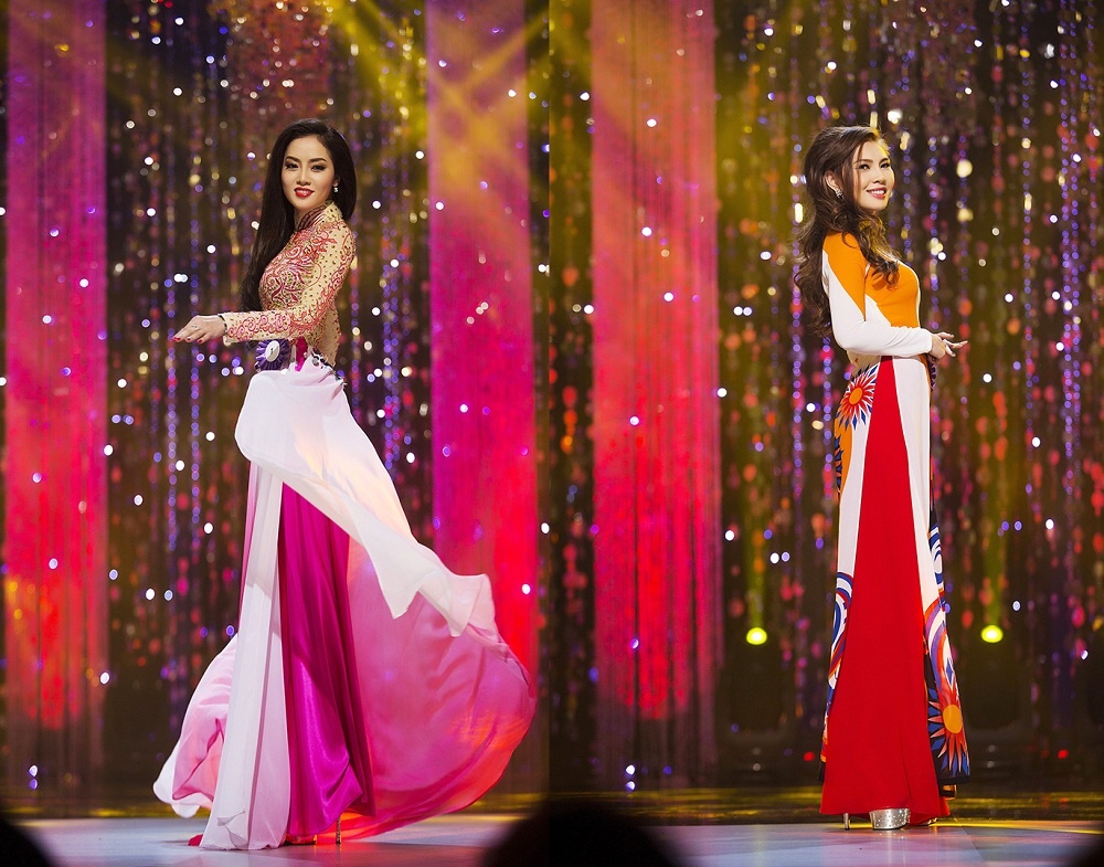 | Các thí sinh khoe sắc duyên dáng và nổi bật với bộ sưu tập áo dài của NTK Sơn Collection trên sân khấu. |