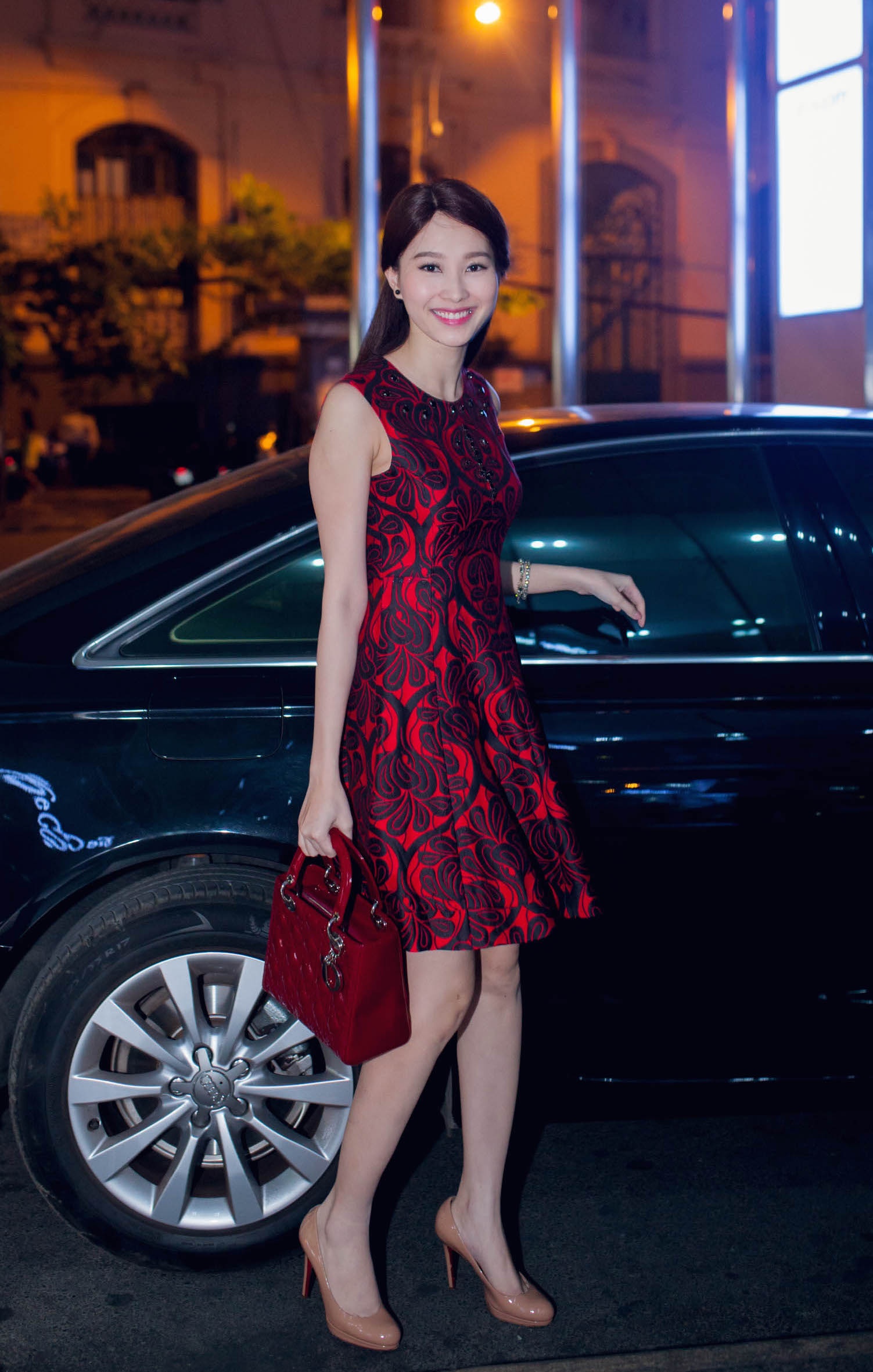 | Cô đi xe sang đến sự kiện và luôn giữ nụ cười rạng rỡ trên môi. |