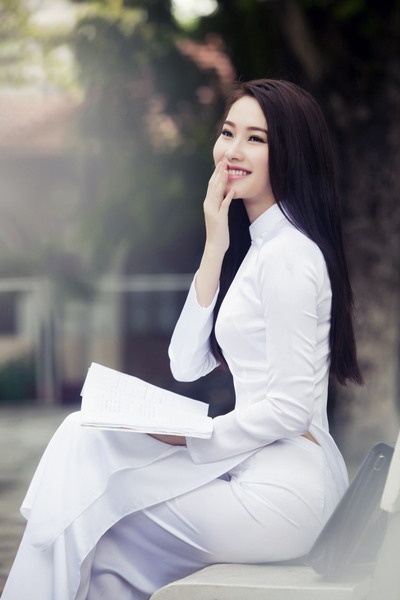 | Thu Thảo đẹp dịu dàng trong chiếc áo dài truyền thống và mái tóc đen huyền. |