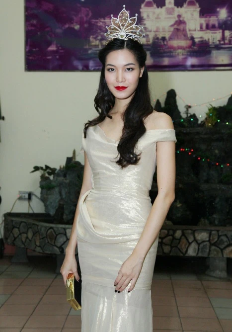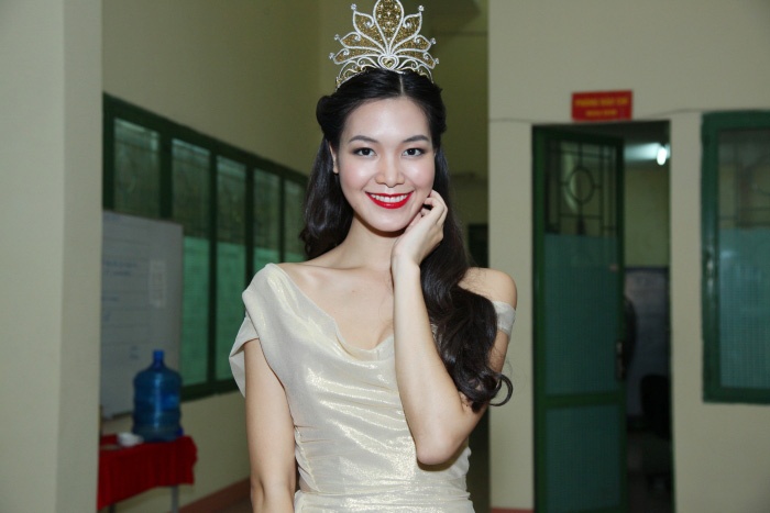 Đúng như đã hẹn, Thùy Dung đã có mặt rất đúng giờ để chuẩn bị lên sân khấu. Người đẹp này cũng tỏ ra rất đầu tư cho phần xuất hiện của mình với bộ trang phục rất lộng lẫy và vương miện cài trên tóc.