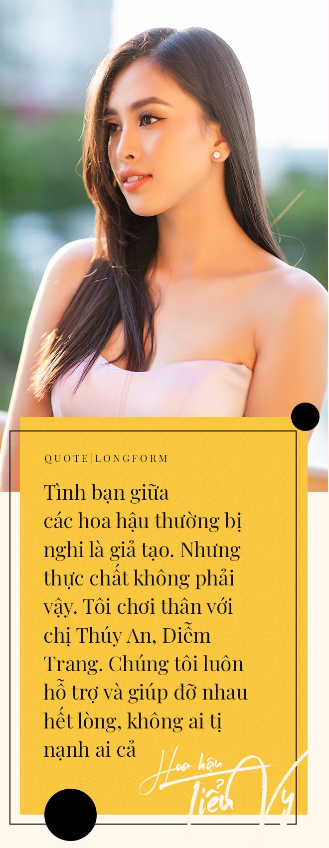 - Tôi thấy tình bạn giữa các hoa hậu vẫn tồn tại. Tôi chơi thân với chị Thúy An, chị Diễm Trang. Các chị em thường giúp đỡ, hỗ trợ lẫn nhau. Chị Đỗ Mỹ Linh và Lương Thùy Linh tôi cũng hay trò chuyện. Mọi người đều vui vẻ, không ai tị nạnh ai cả.