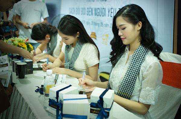 | Thùy Dung, Kỳ Duyên... cùng ký tặng sách cho hàng trăm bạn trẻ tham dự sự kiện. |