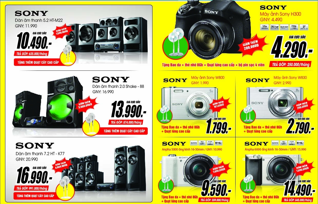 Mức giảm giá hấp dẫn trong đợt này còn dành cho các sản phẩm dàn âm thanh Sony. Cụ thể, dàn âm thanh Sony 5.2 HT-M22 giảm 1 triệu đồng còn 10,49 triệu đồng, dàn âm thanh 2.0 Shake-88 giảm 3 triệu đồng còn 13,99 triệu đồng, dàn âm thanh Sony 7.2 HT-K77 giảm 4 triệu đồng còn 16,99 triệu đồng. Ba model dàn âm thanh này đều được tặng thêm quạt cây cao cấp.
