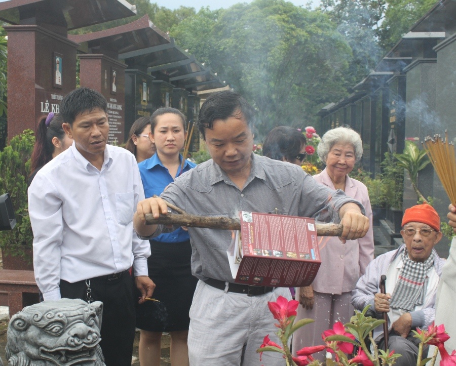 | Bà Tám Thảo, ông Mười Hương (thứ ba từ trái sang) và ông Nguyễn Văn Phước thắp hương trước mộ Thiếu tướng Phạm Xuân Ẩn. |
