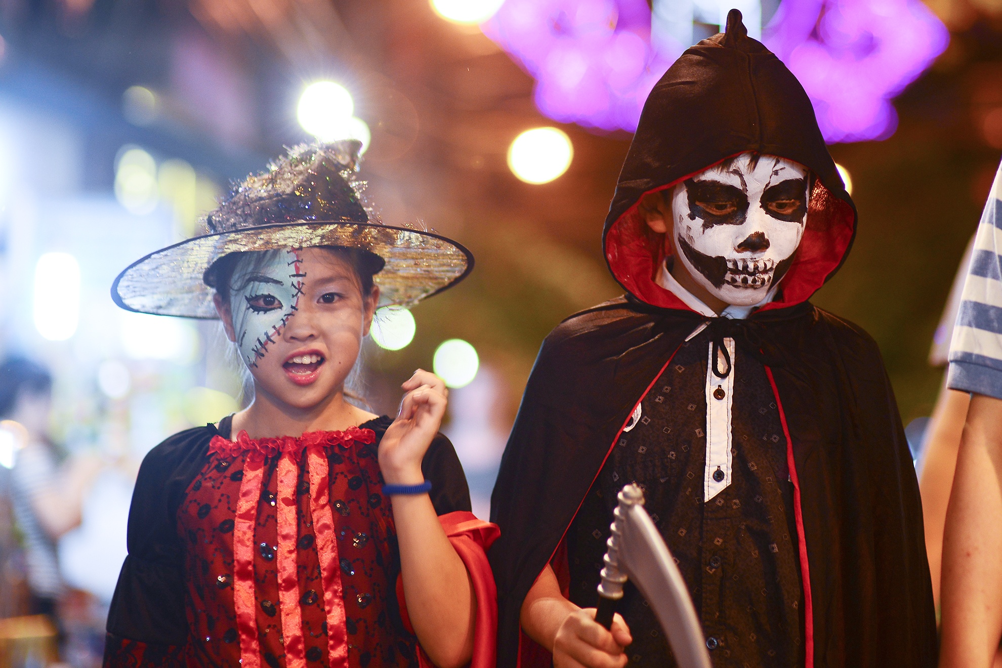 Một số bạn nhỏ hoá trang thành tử thần và phù thuỷ đi bộ trên phố Hàng Buồm.