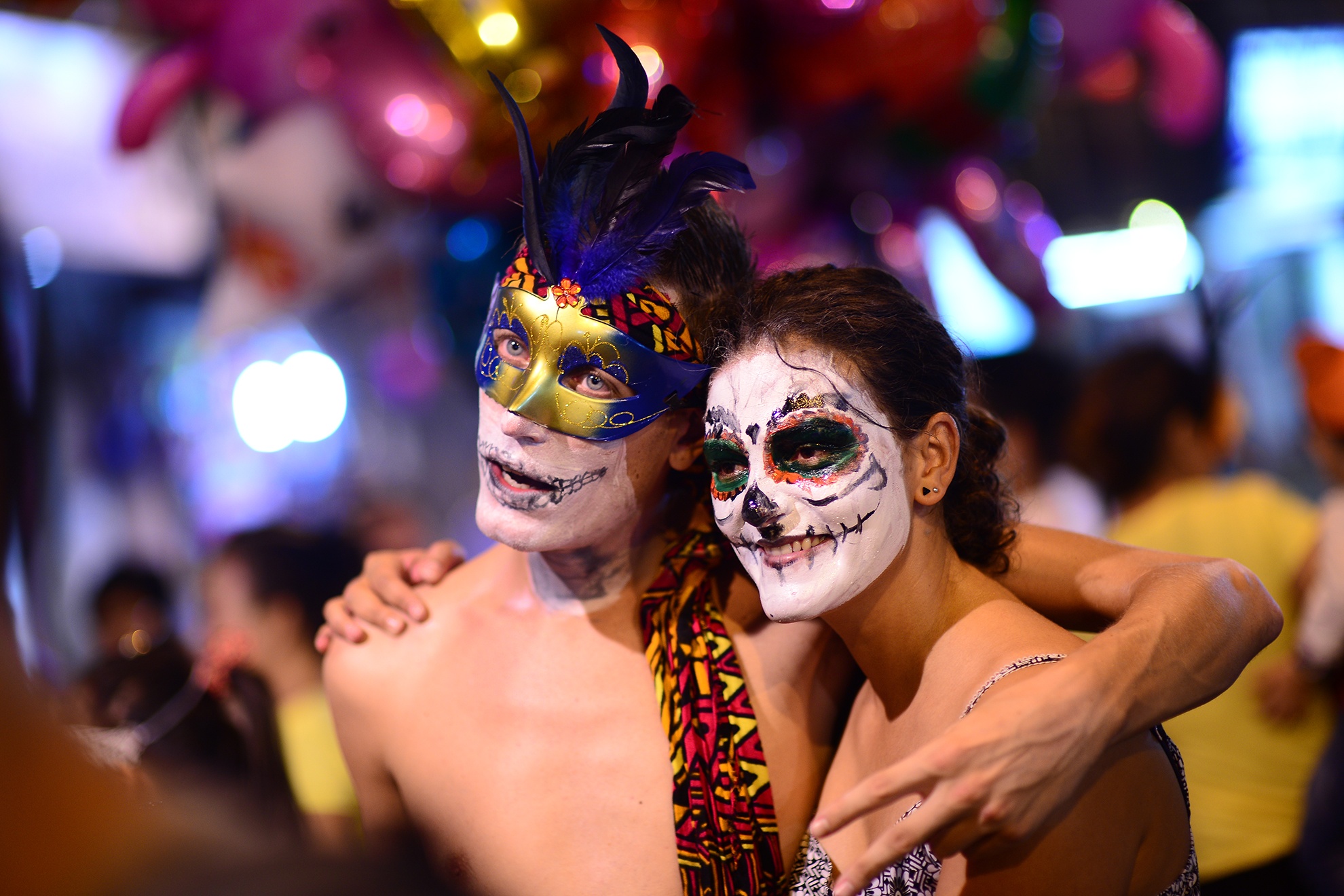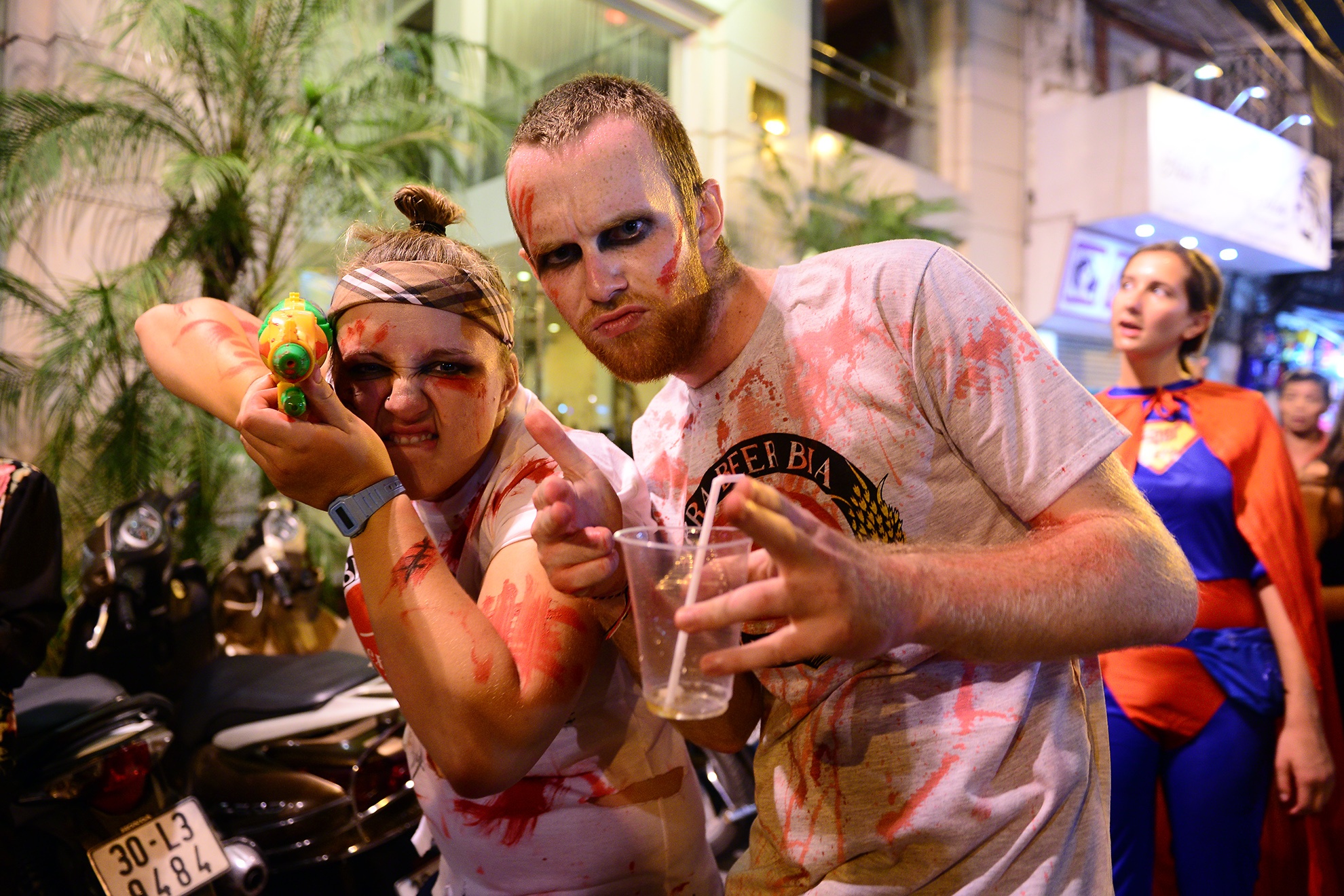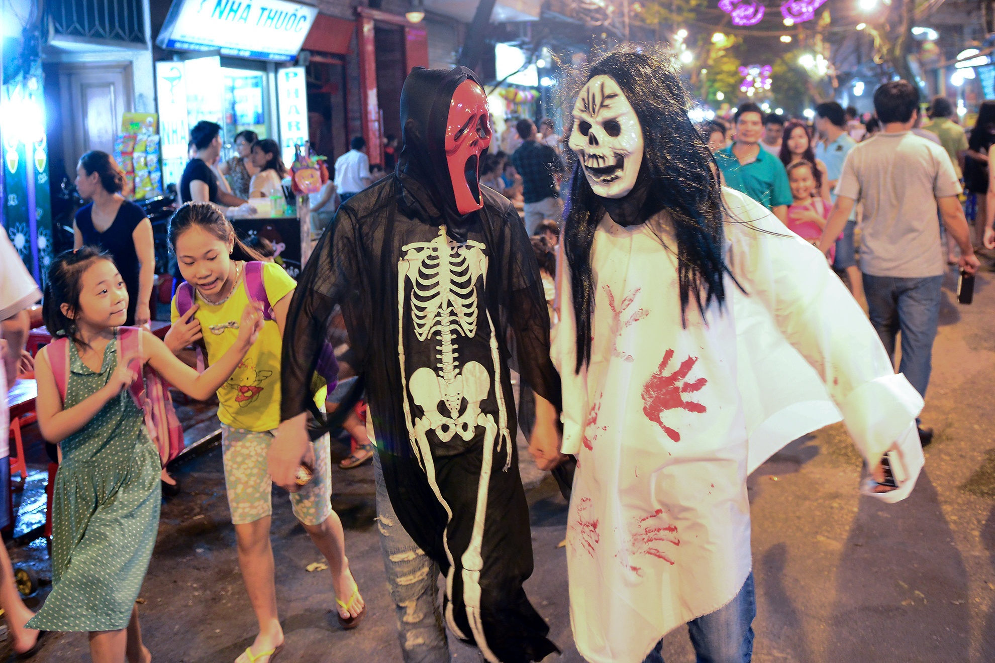 Giới trẻ và du khách nước ngoài tự đeo mặt nạ, hóa trang các loại hình thù ghê sợ, lang thang trên phố cổ Hà Nội đùa nghịch, dọa ma trong đêm 31/10 để hưởng ứng lễ hội Halloween.