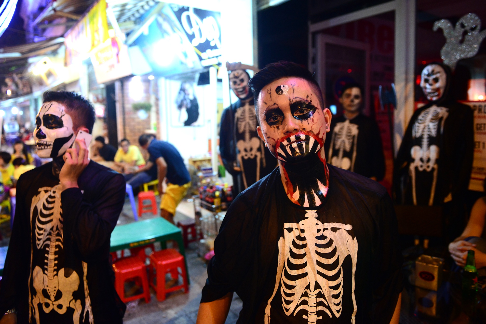 | Nhiều hàng quán cũng theo phong trào trang trí ma nơ canh hình xương người, còn nhân viên phục vụ được hoá trang như những xác chết mặt quỷ. |