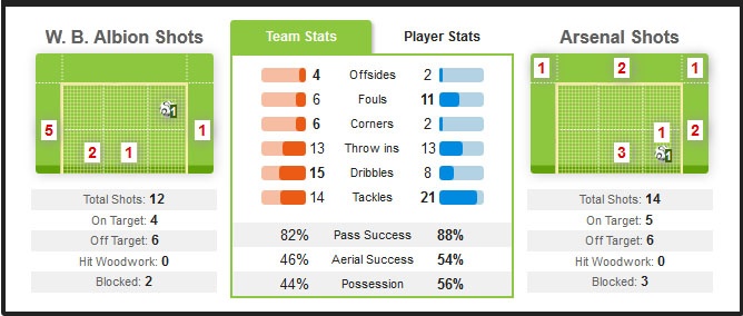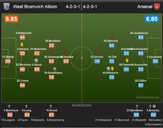 | Đội hình ra sân của West Brom và Arsenal. |