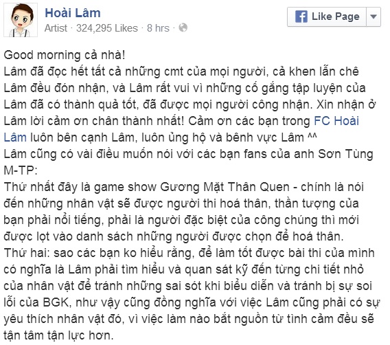 Hoài Lâm nói thêm: "Cho dù các bạn có ác cảm đi nữa nhưng trong thâm tâm các bạn phải thừa nhận một điều là Lâm đã làm tốt bài thi của mình chứ? Đó chính là sự nỗ lực của Lâm để thêm một lần nữa công nhận cái tài của Sơn Tùng. Lâm nghĩ, anh Sơn Tùng sẽ thấy vui khi nhìn thấy Lâm hoá thân thành anh ấy trên sân khấu Gương mặt thân quen".