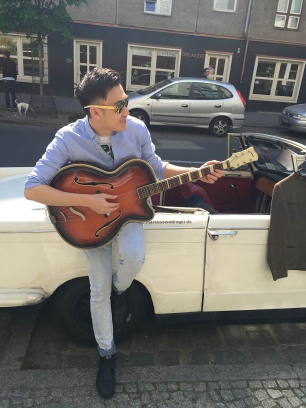 | Nam ca sĩ ngẫu hứng tạo dáng chụp hình trên đường phố Mỹ. Trở về Việt Nam, Dương Triệu Vũ tiếp tục đi hát tại các tỉnh phía Bắc. Bên cạnh đó, anh hoàn thành MV Muộn màng gửi đến khán giả trong thời gian tới. |