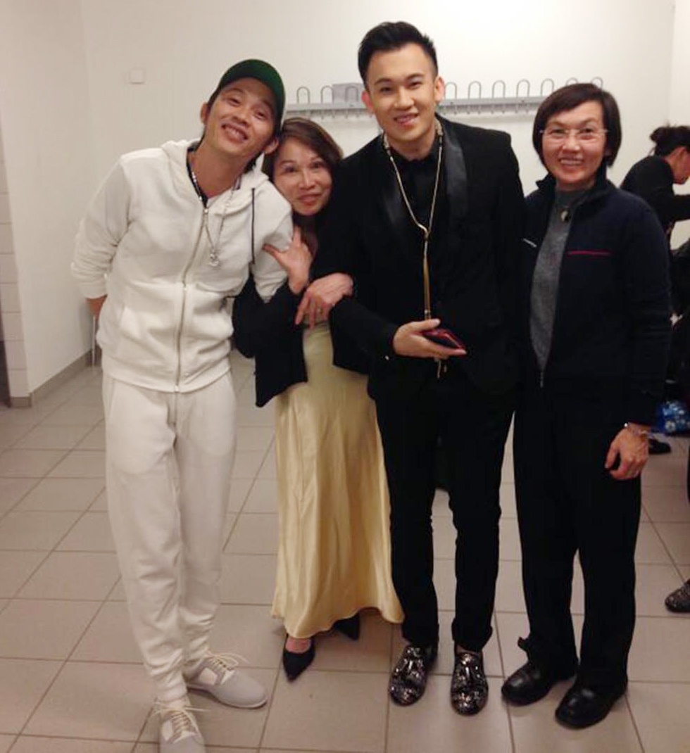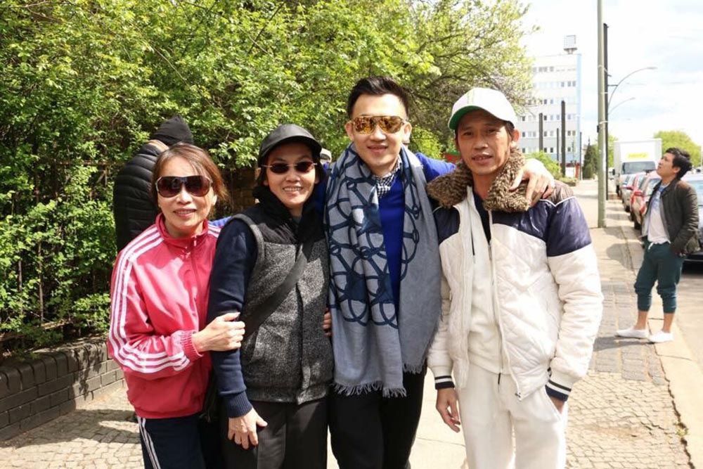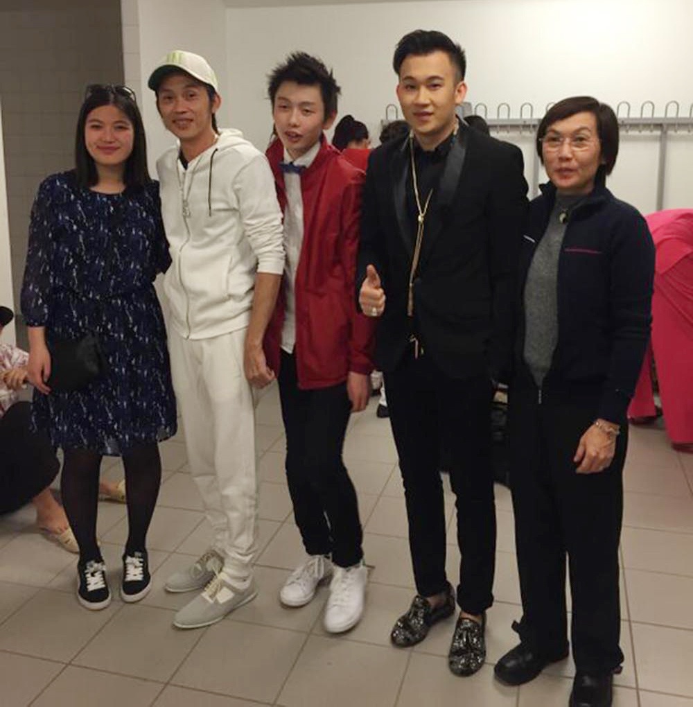 | Danh hài Hoài Linh, Dương Triệu Vũ chụp hình cùng người thân trong hậu trường. Khi biết hai anh em lưu diễn tại Mỹ, người nhà sắp xếp công việc đến cổ vũ. |