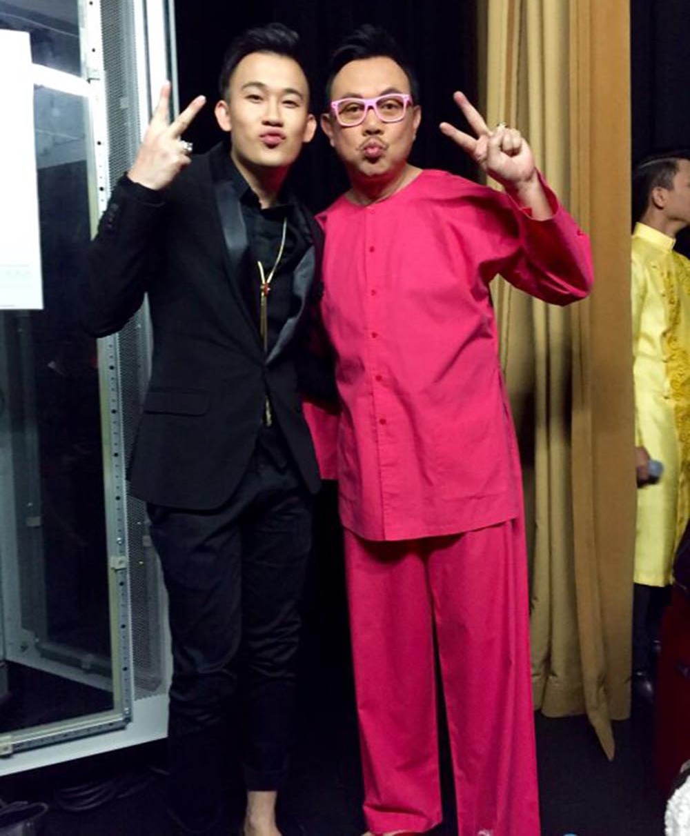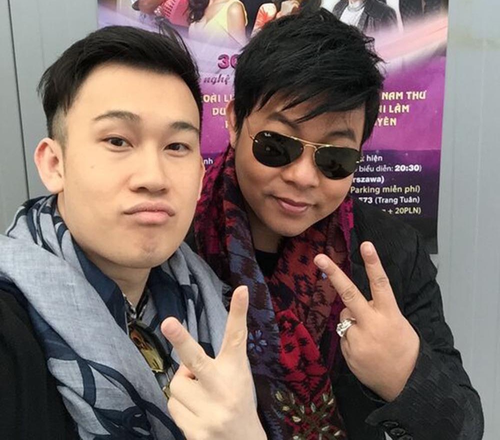 | Dương Triệu Vũ hào hứng khi gặp đàn anh Quang Lê. Hai anh em thường xuyên gặp nhau trong các show diễn ở thị trường hải ngoại. |