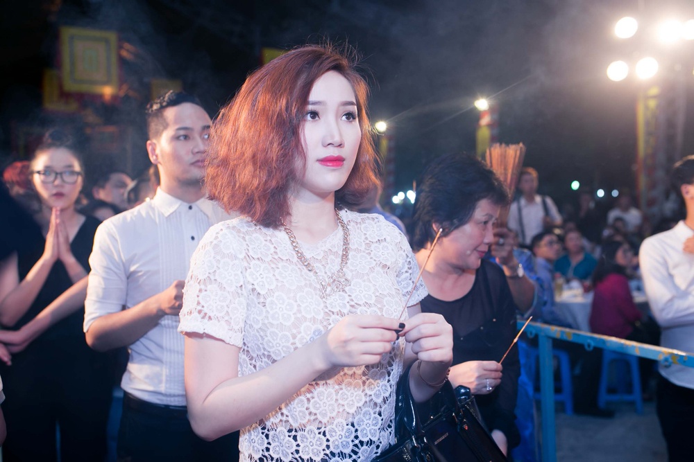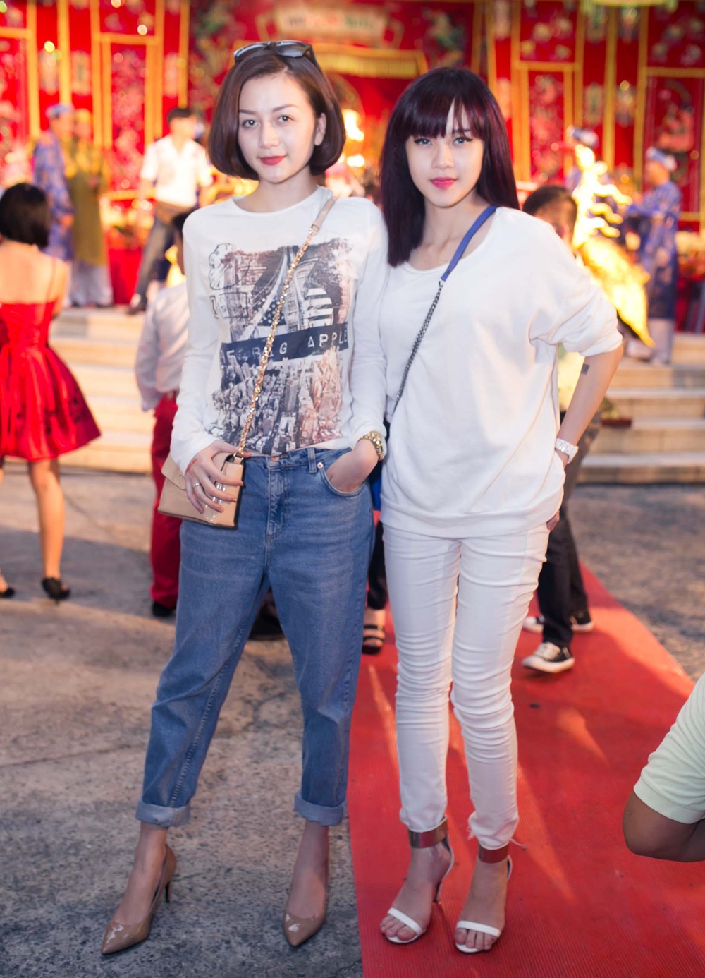 Chị em Thiều Bảo Trang có mặt khá sớm để xếp hàng chờ lượt cúng Tổ. Khác với phong cách quyến rũ, nóng bỏng thường ngày, hai cô gái ăn vận khá kín đáo cùng quần jeans và áo pull.