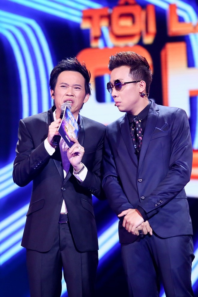 Trấn Thành xoay xở điệu nhảy anh trình diễn trên sân khấu trong khi Hoài Linh lại thoải mái hơn vì không phải nhảy. |