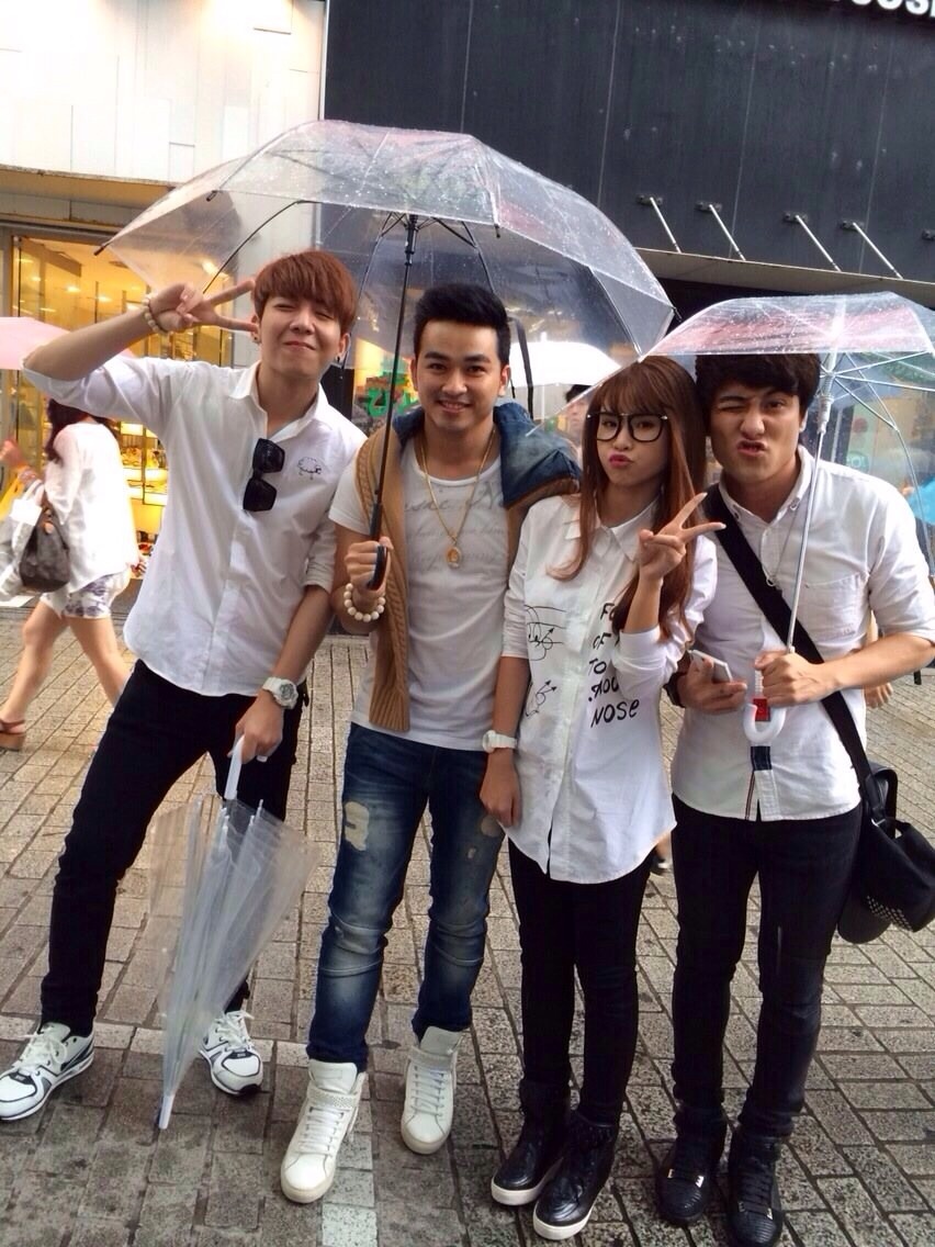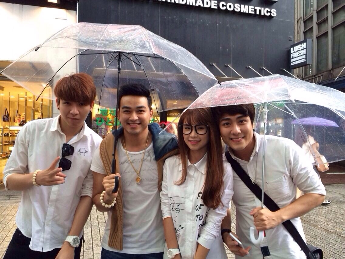 | Khởi My đi chung ô với thành viên nhóm La Thăng. |