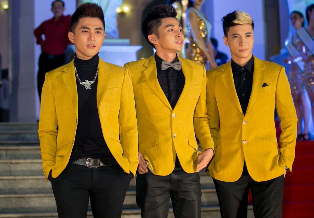 | Các thành viên nhóm 365 lịch lãm với vest vàng. |