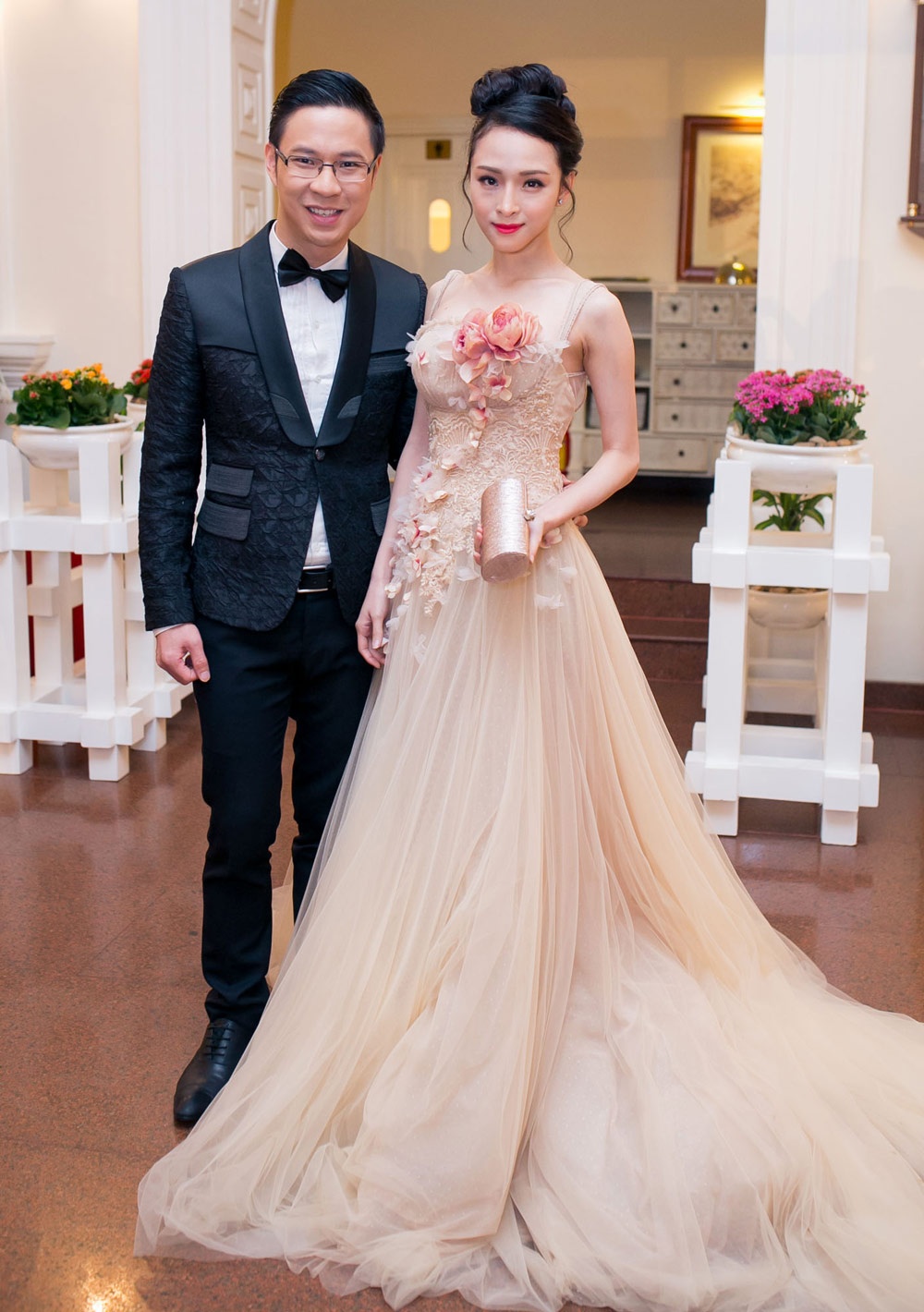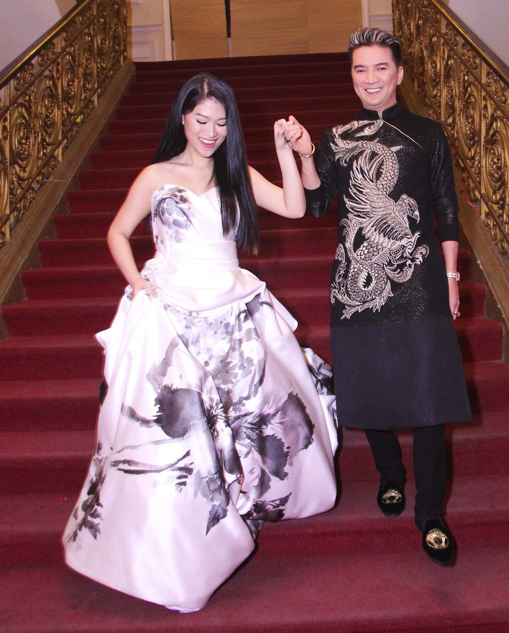 | Hoa hậu Trương Hồ Phương Nga lộng lẫy trong chiếc đầm dạ hội. Cô đi cùng MC Anh Quân. |