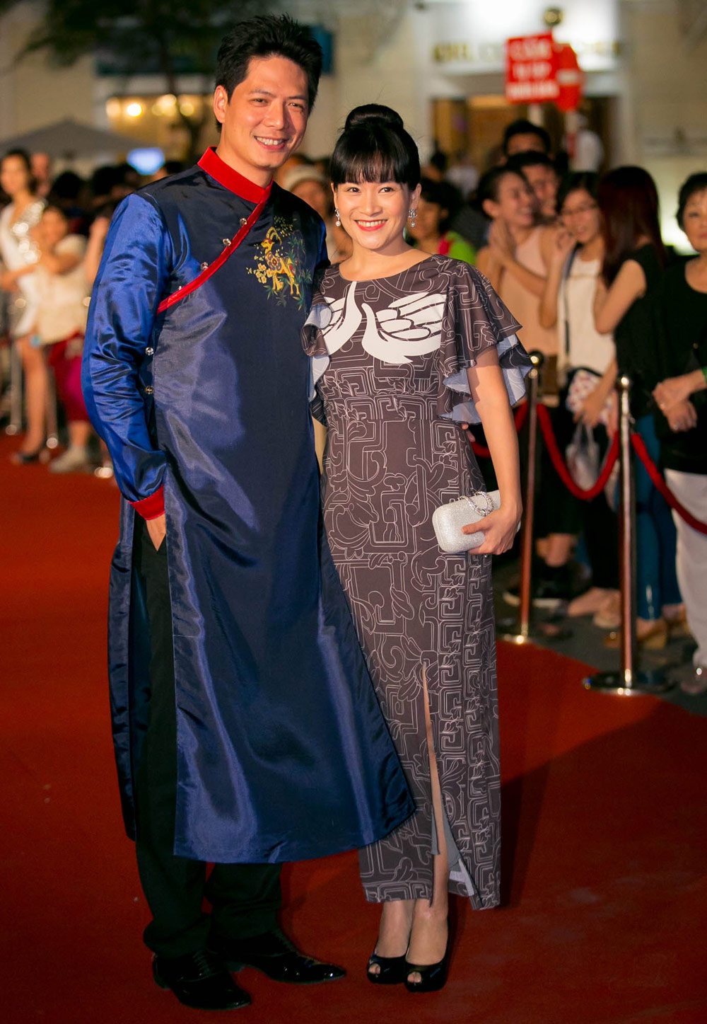 | Vợ chồng Bình Minh hạnh phúc sánh đôi trên thảm đỏ. Không diện những bộ vest bảnh bao như mọi khi, nam diễn viên Hiệp sĩ mù diện áo dài truyền thống khá lạ mắt. |