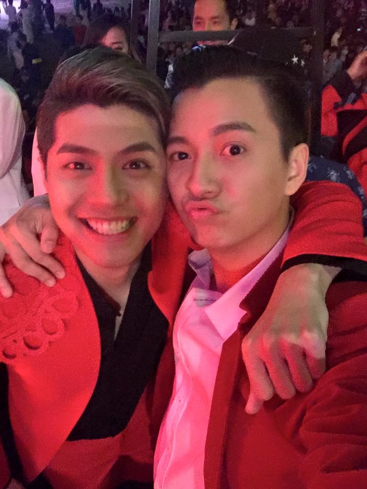 Trong đêm giao thừa, Ngô Kiến Huy chạy show nhiều nơi. Dù mệt nhưng giọng ca điển trai rất háo hức vì còn được khán giả yêu thương và gặp gỡ đồng nghiệp. "Chàng Bắp" và Noo Phước Thịnh không hẹn mà gặp đều chọn tông đỏ rực rỡ để may mắn cả năm. |