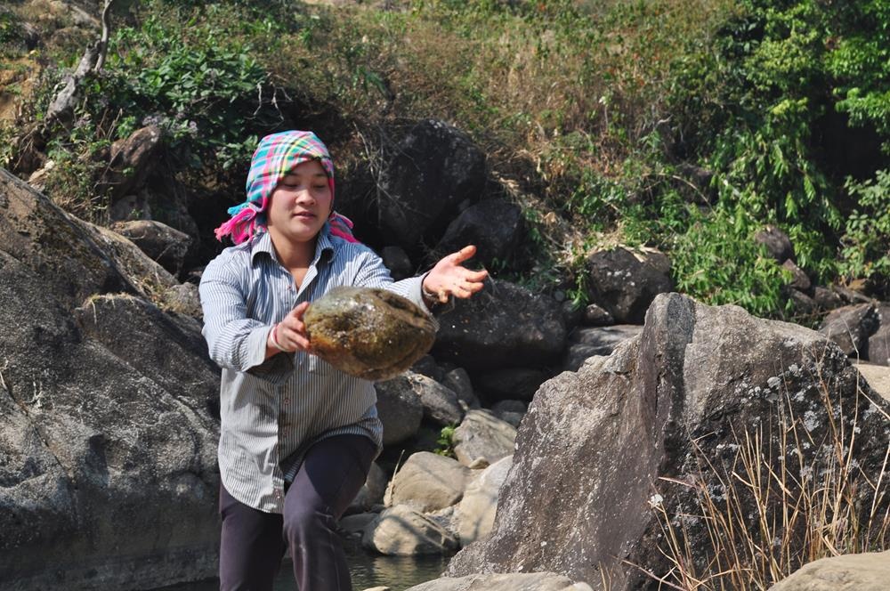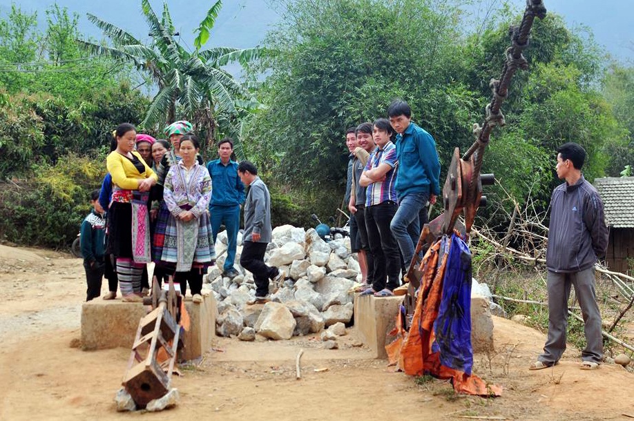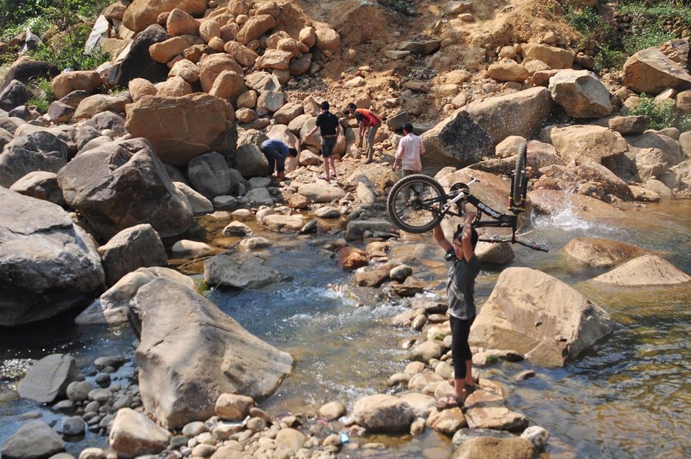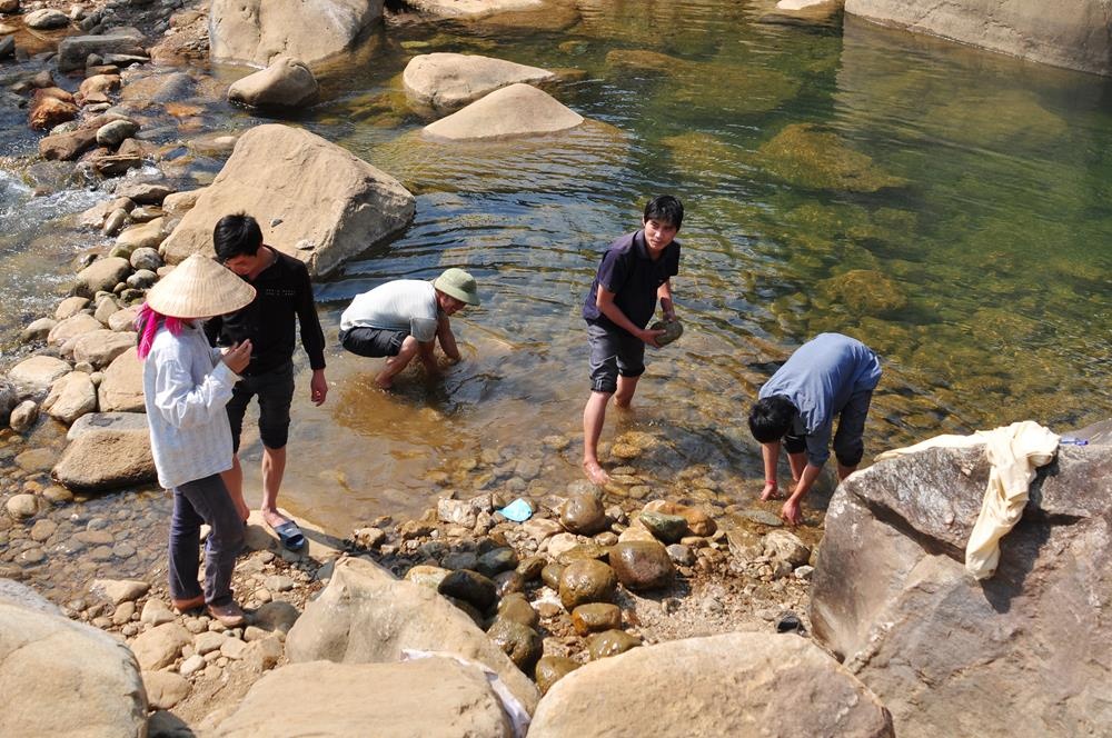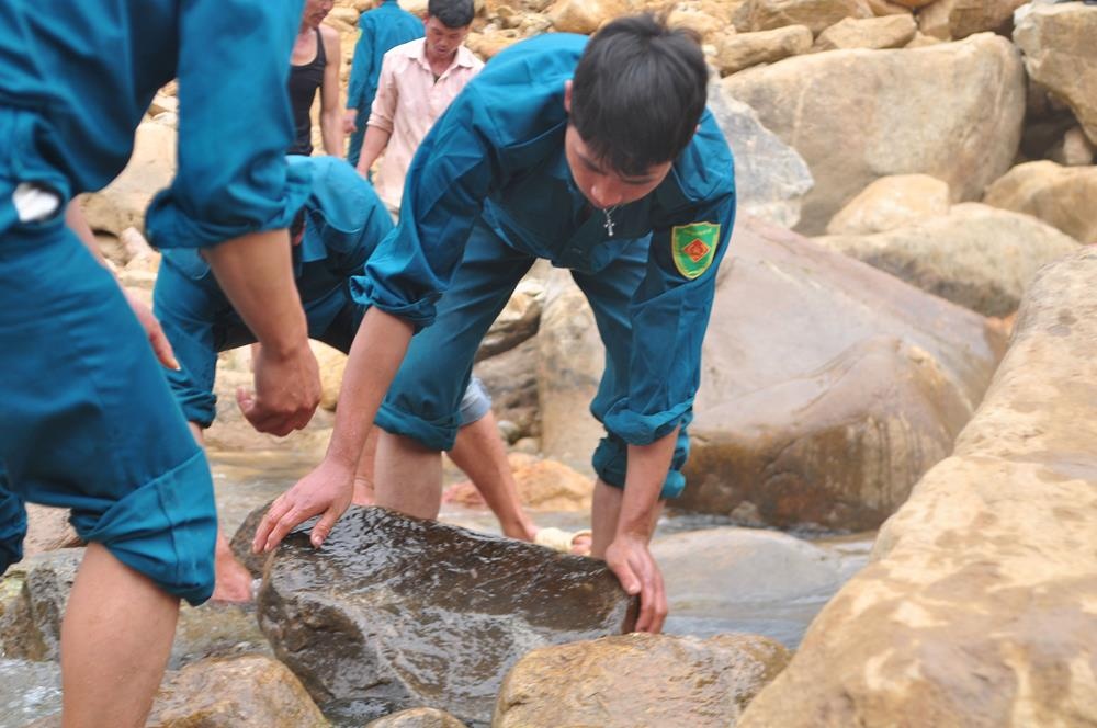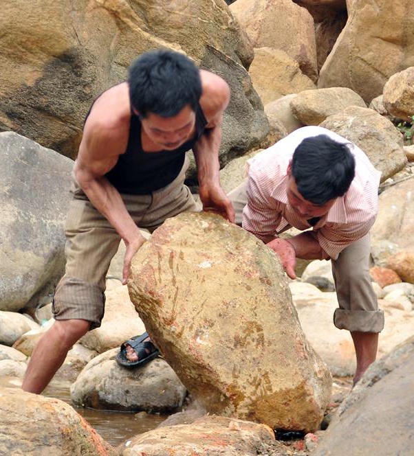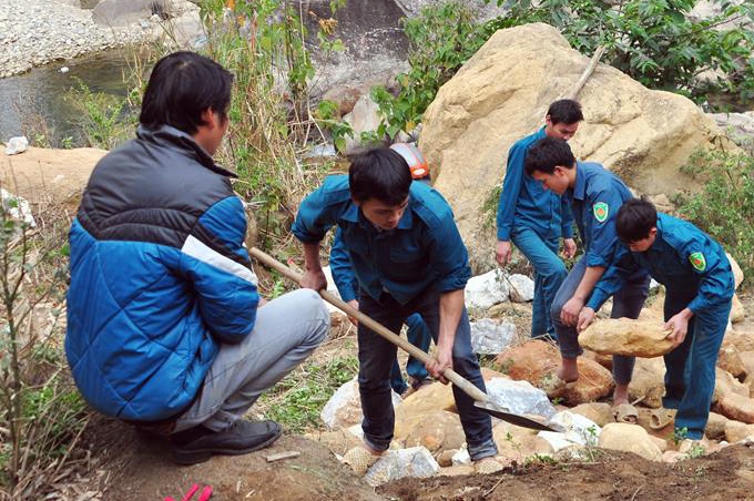 Những tảng đá hộc, đá cuội cỡ lớn được người dân vần từ hai bên bờ suối xuống nắn dòng nước tạo thành đường đi cơ bản. Mỗi khối đá nặng hàng tạ khiến công nhân mất khá nhiều sức và thời gian.