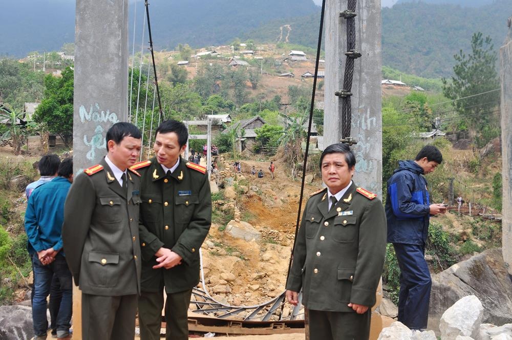| Ông Vừ A Chía (phải) - Phó Giám đốc công an tỉnh Lai Châu tới hiện trường chỉ đạo công tác làm cầu. Ông Chía cũng cho biết: "Cầu tạm bắt đầu tiến hành thi công từ sáng nay 26/2, chúng tôi đang khẩn trương vận động bà con, dân quân tự vệ địa phương hỗ trợ đơn vị thi công để cầu sớm hoàn thành đưa vào sử dụng". |