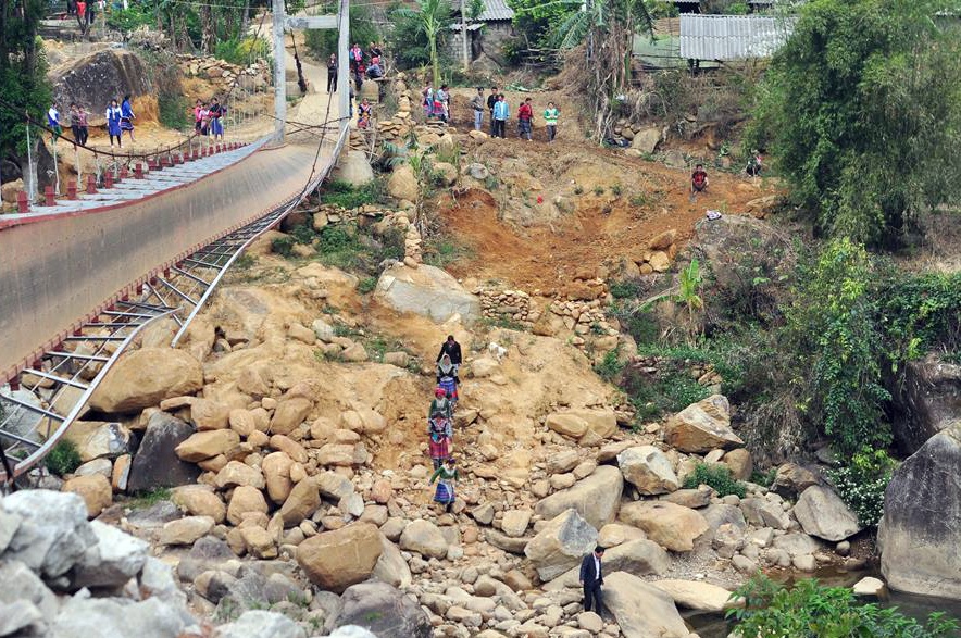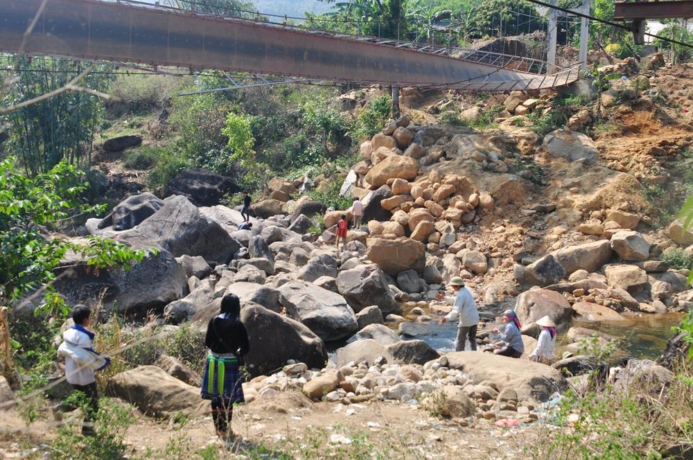 | Trong khi chờ đợi cây cầu tạm, mọi người dân bản Chu Va 6 muốn ra ngoài đều phải lội qua suối, các vật dụng đều phải vác, khiêng qua. |