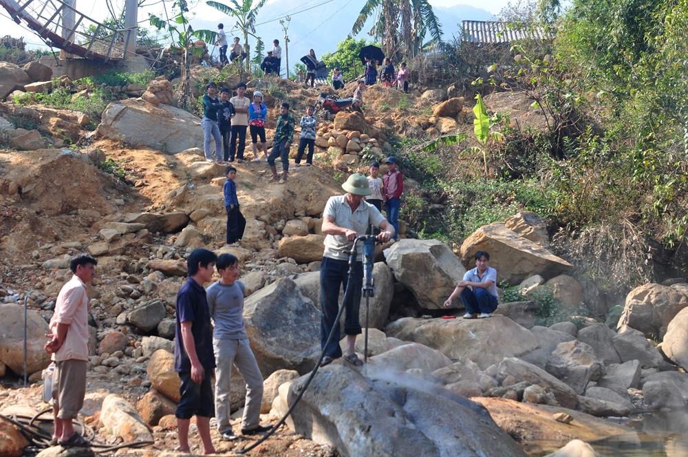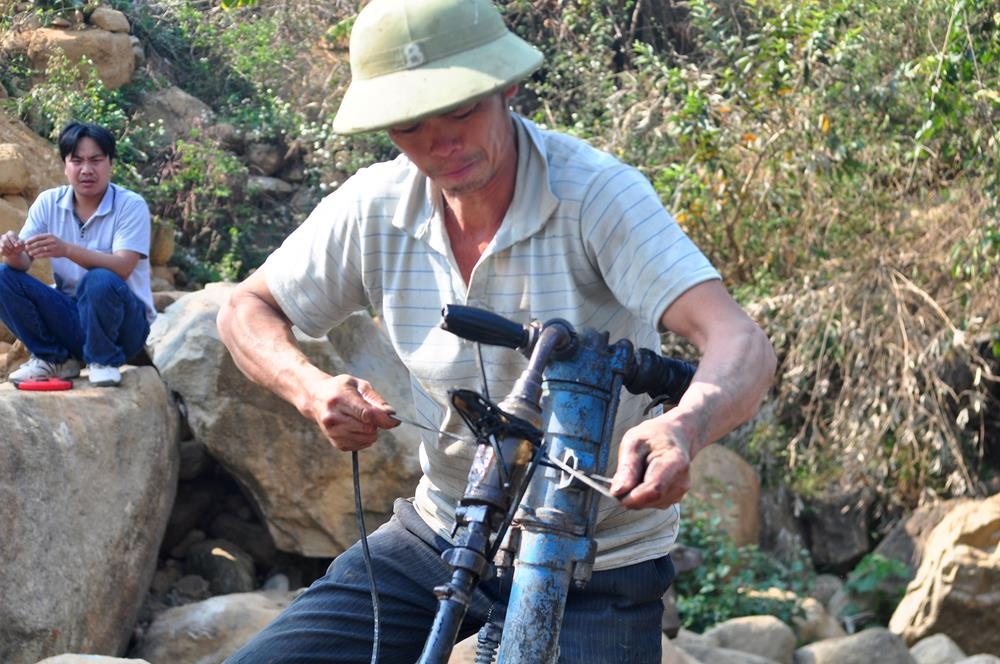 | Thợ khoan chật vật vì mũi khoan bằng hơi gặp khó bởi những tảng đá lớn quá cứng. |