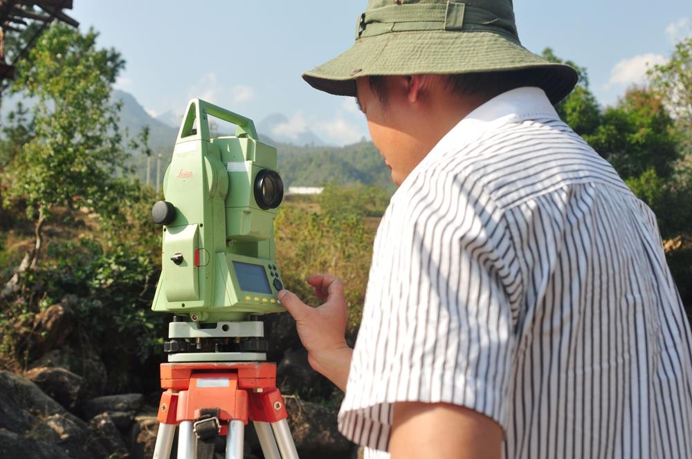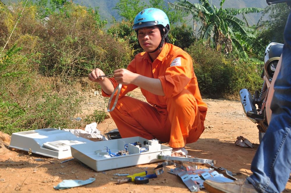 | Theo tiến độ thi công, buổi chiều đoàn tư vấn thiết kế kỹ thuật sẽ ngắm tim và đo đạc các thông số. Phía trên, một công nhân điện lực tiến hành lắp đồng hồ điện riêng phục vụ tổ thi công. |